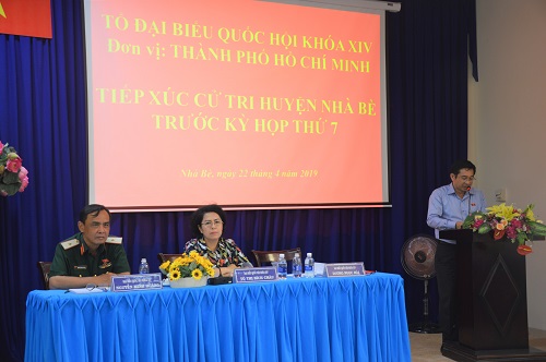 (QK7 Online) - Chuẩn bị cho kỳ họp lần thứ 7, Quốc hội Khóa XIV dự kiến khai mạc vào ngày 20-5-2019, ngày 22-4-2019, Tổ đại biểu số 2, đơn vị Thành phố Hồ Chí Minh gồm các đồng chí: Thiếu tướng Nguyễn Minh Hoàng, Phó Chính ủy Quân khu 7; Tô Thị Bích Châu, UVBTV Thành ủy, Chủ tịch UBMTTQ Thành Phố Hồ Chí Minh, Dương Ngọc Hải, Viện trưởng Viện kiểm sát Thành phố Hồ Chí Minh đã tiếp xúc cử tri tại các huyện Nhà Bè, quận 7.