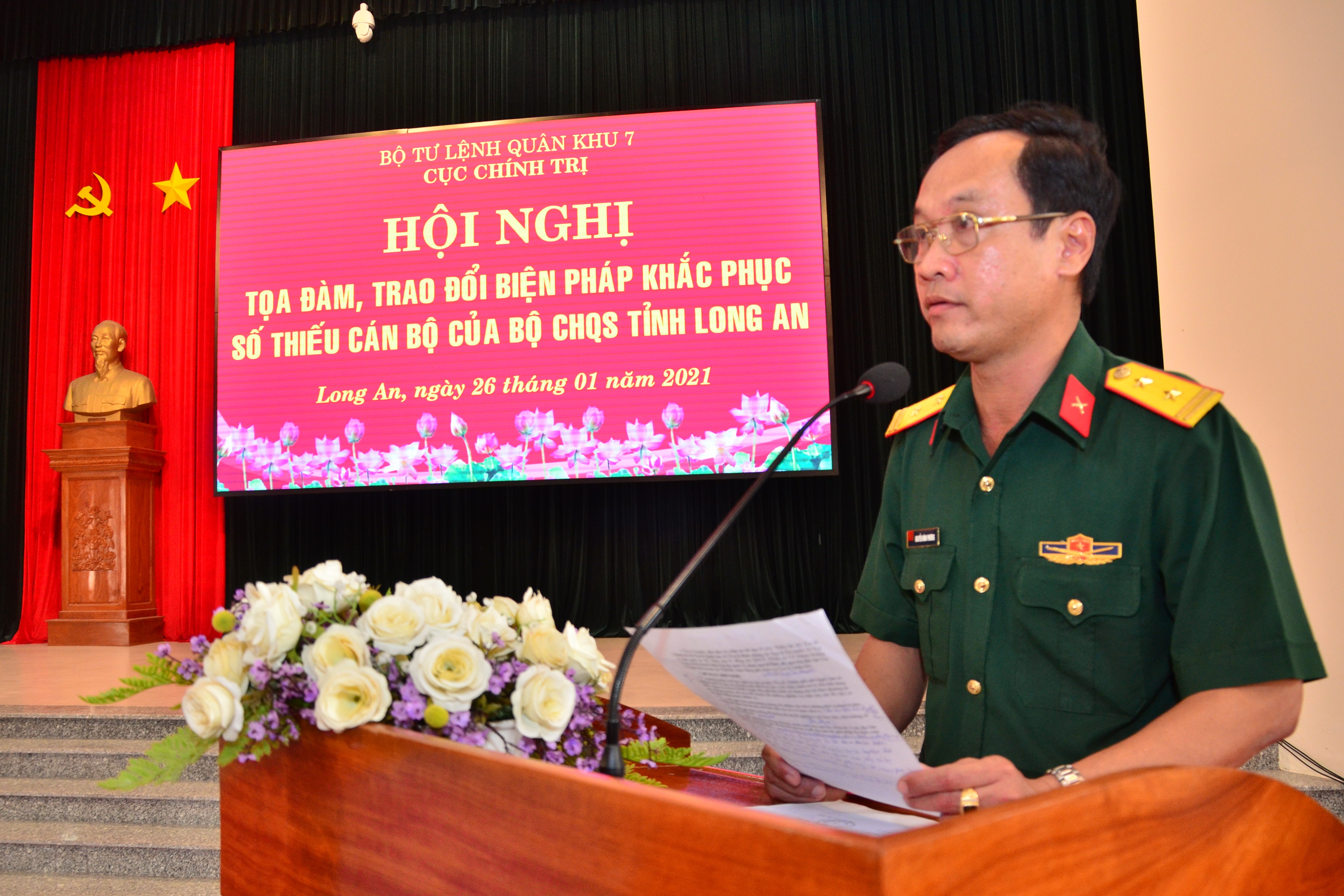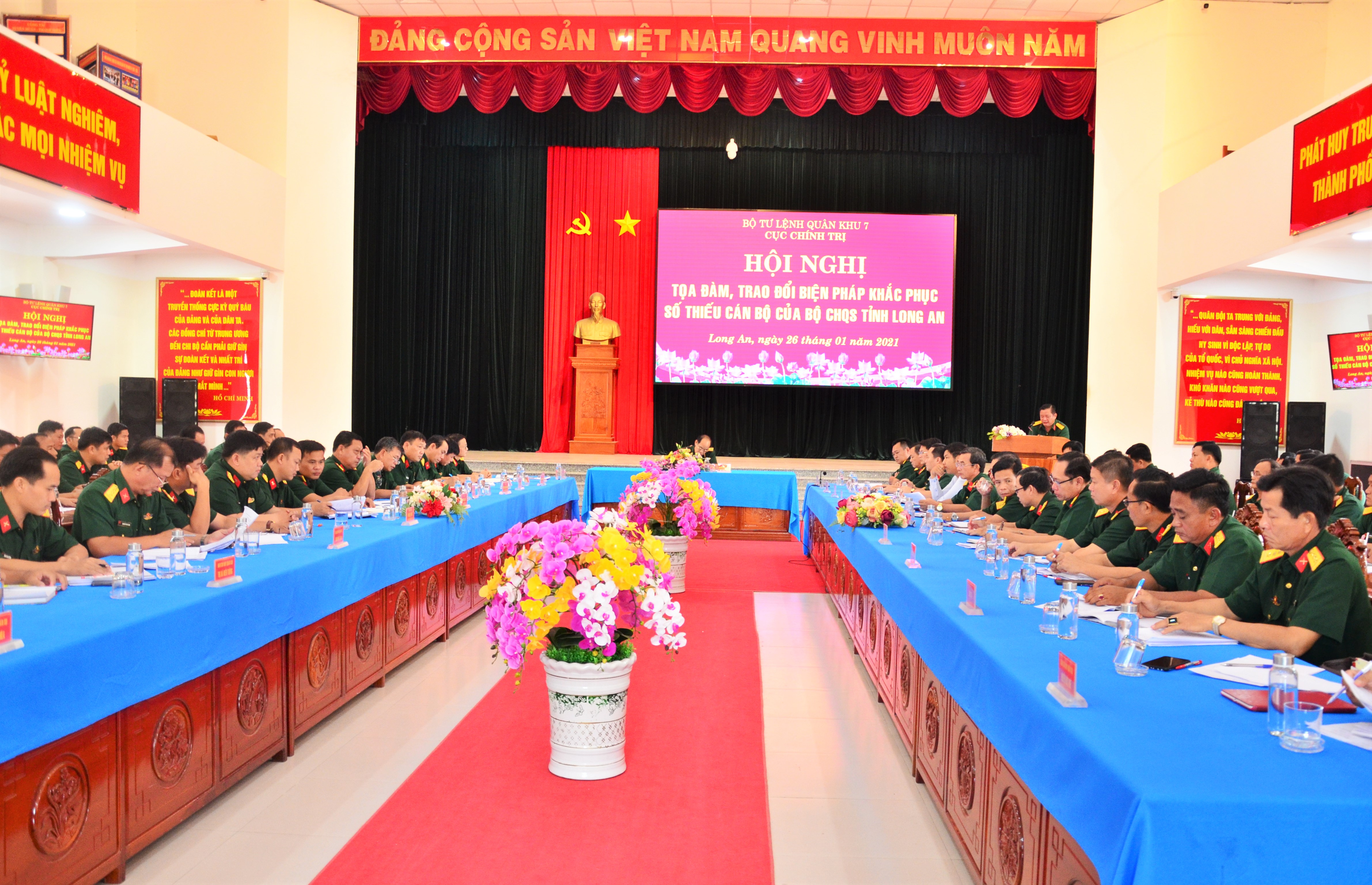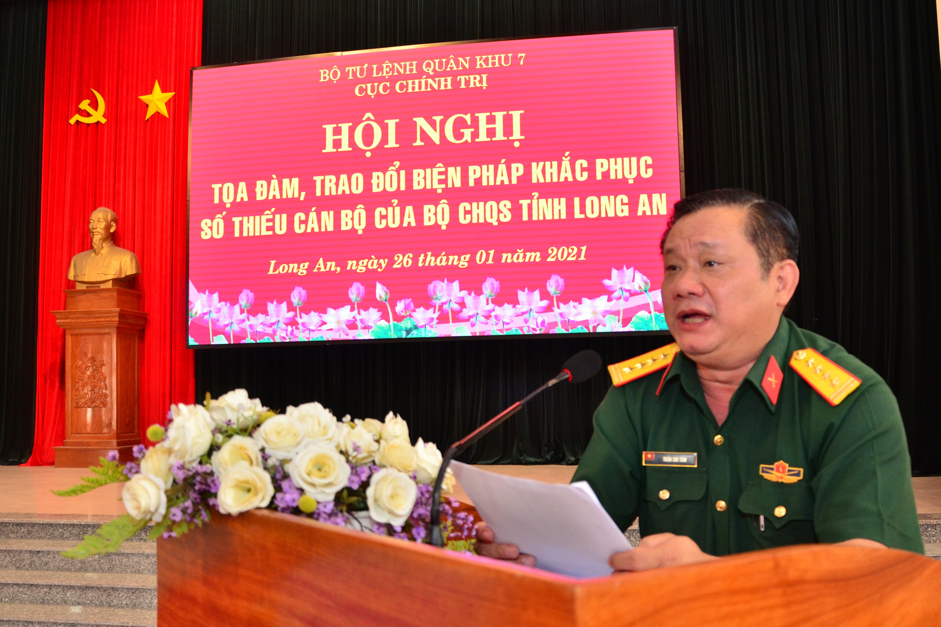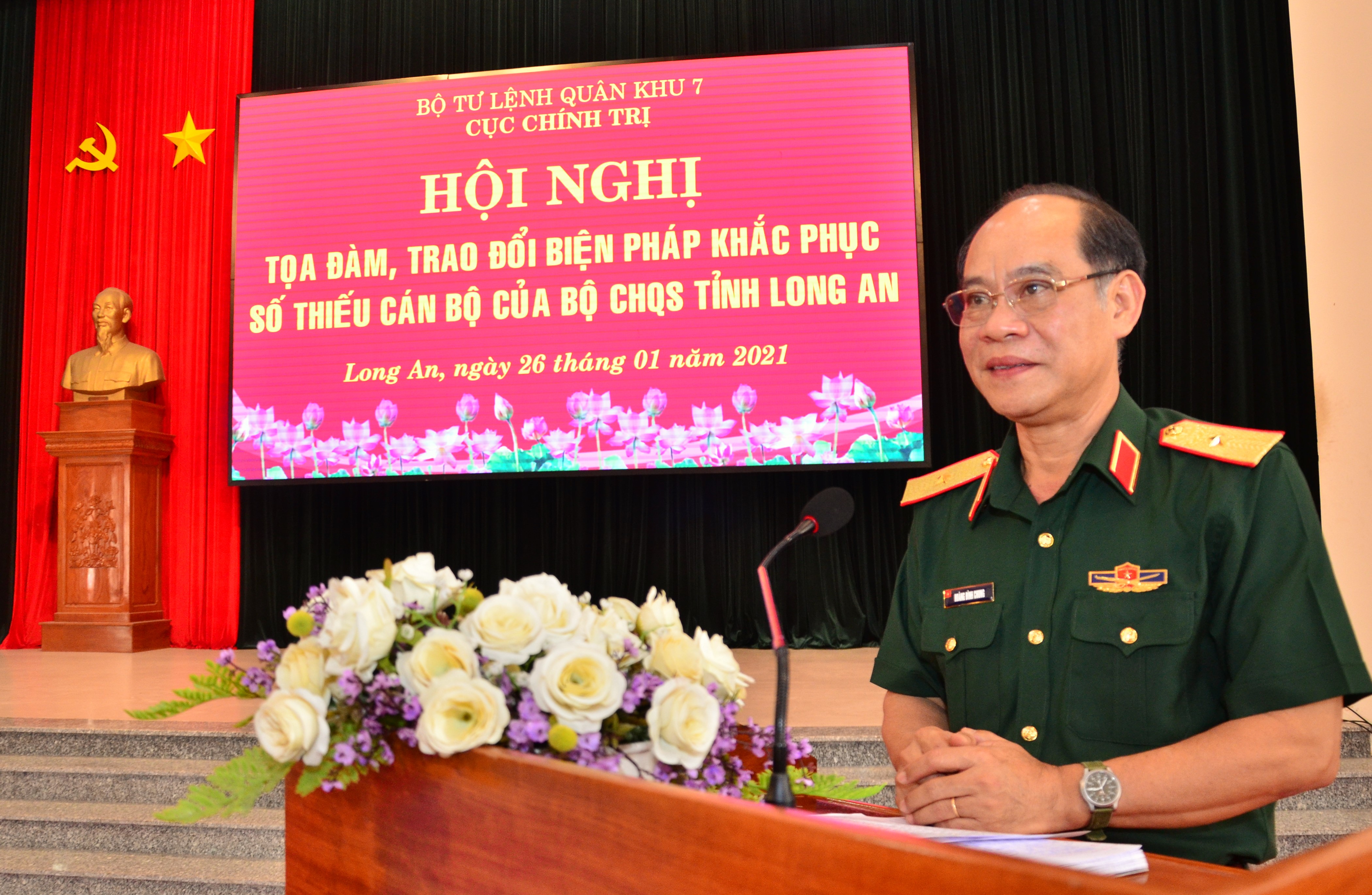 (QK7 Online) - Chiều ngày 26/1, tại Bộ CHQS tỉnh Long An, Cục Chính trị Quân khu 7 tổ chức tọa đàm, trao đổi các biện pháp khắc phục tình trạng thiếu cán bộ trong lực lượng vũ trang tỉnh Long An. Thiếu tướng Hoàng Đình Chung, Chủ nhiệm Chính trị Quân khu chủ trì tọa đàm.