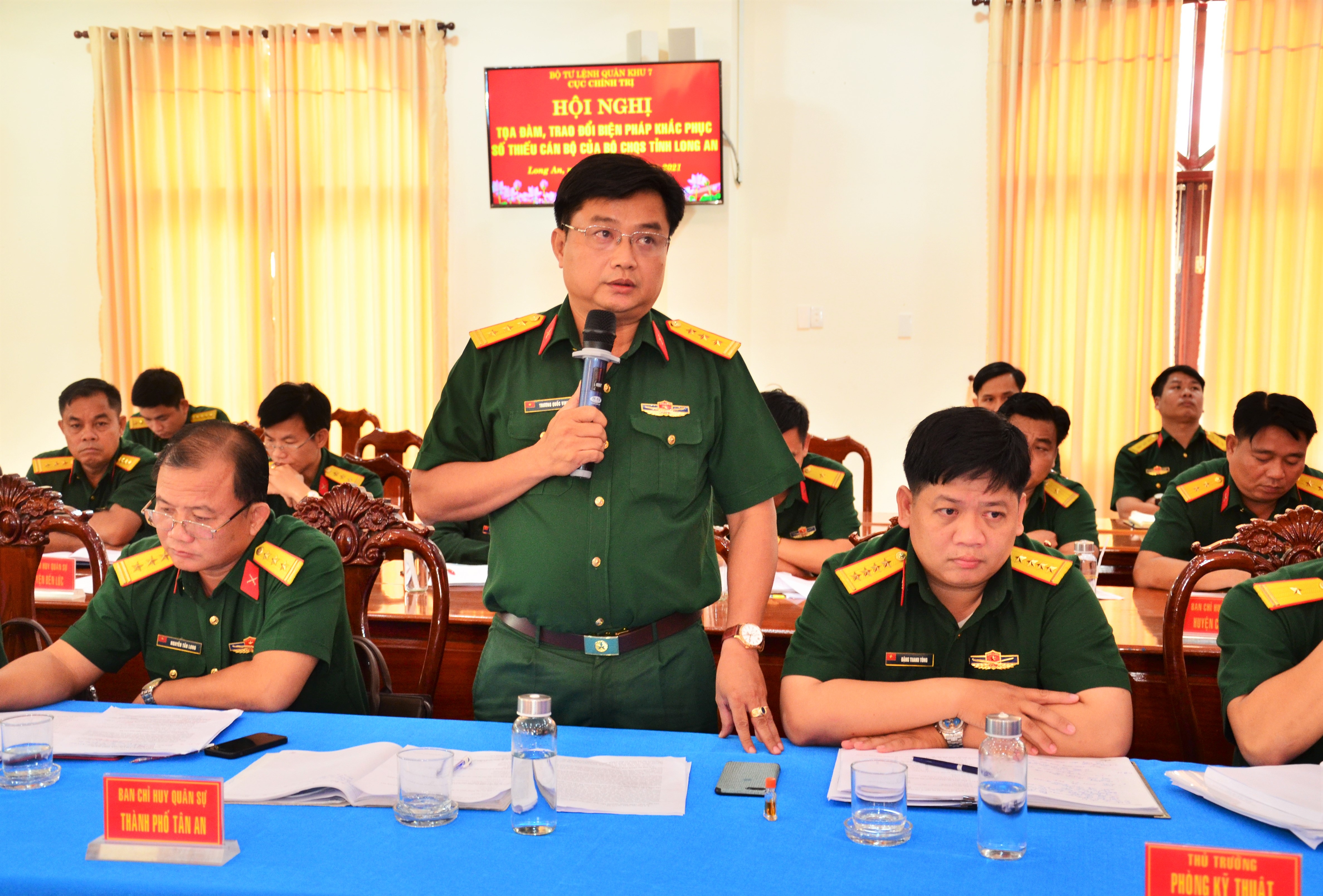 Đại tá Trần Vinh Ngọc, Chính ủy Bộ CHQS tỉnh Long An cho biết, Nghị quyết Đại hội lần thứ XII, nhiệm kỳ 2020 – 2025 của Đảng ủy Quân sự tỉnh đã thể hiện quyết tâm cao trong việc giải quyết tình trạng thiếu cán bộ. Trong đó, Đảng ủy, Bộ CHQS tỉnh đã tham mưu cho Tỉnh ủy, UBND tỉnh thực hiện đề án nâng cao chất lượng đội ngũ cán bộ. Thường xuyên tạo điều kiện tốt nhất cho đội ngũ cán bộ có mong muốn về công tác tại địa phương. Đồng thời, công tác quản lý, bố trí cán bộ theo quy hoạch được thực hiện khách quan, dân chủ. Bộ CHQS tỉnh cũng tập trung quan tâm tới hậu phương Quân đội như: Đề nghị Bộ Quốc phòng xây dựng nhà ở công vụ cho cán bộ, xây dựng nhà đồng đội…”