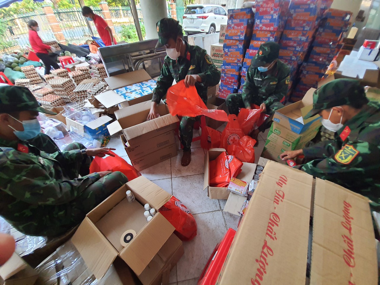 Lúc đến trụ sở Hội Chữ thập đỏ tỉnh Bình Dương, đã gần xế chiều nhưng tất cả mọi người ở đây vẫn đang hăng say làm việc. Thiếu úy Hoàng Văn Hùng, cán bộ Tiểu đoàn 8, Trung đoàn 271 đang lau sạch từng quả trứng gà, cho biết: “Tiểu đội do tôi phụ trách đảm nhận nhiệm vụ giúp Hội Chữ Thập đỏ tỉnh Bình Dương bốc quà từ xe tải xuống và phân loại, chia quà về cho các địa phương, khu cách ly trong tỉnh. Có những ngày phải bốc xong gần 7 tấn hàng, mồ hôi ướt đẫm, rất mệt mỏi, nhưng anh em vẫn tập trung làm để các phần quà đến với bà con nhanh nhất".