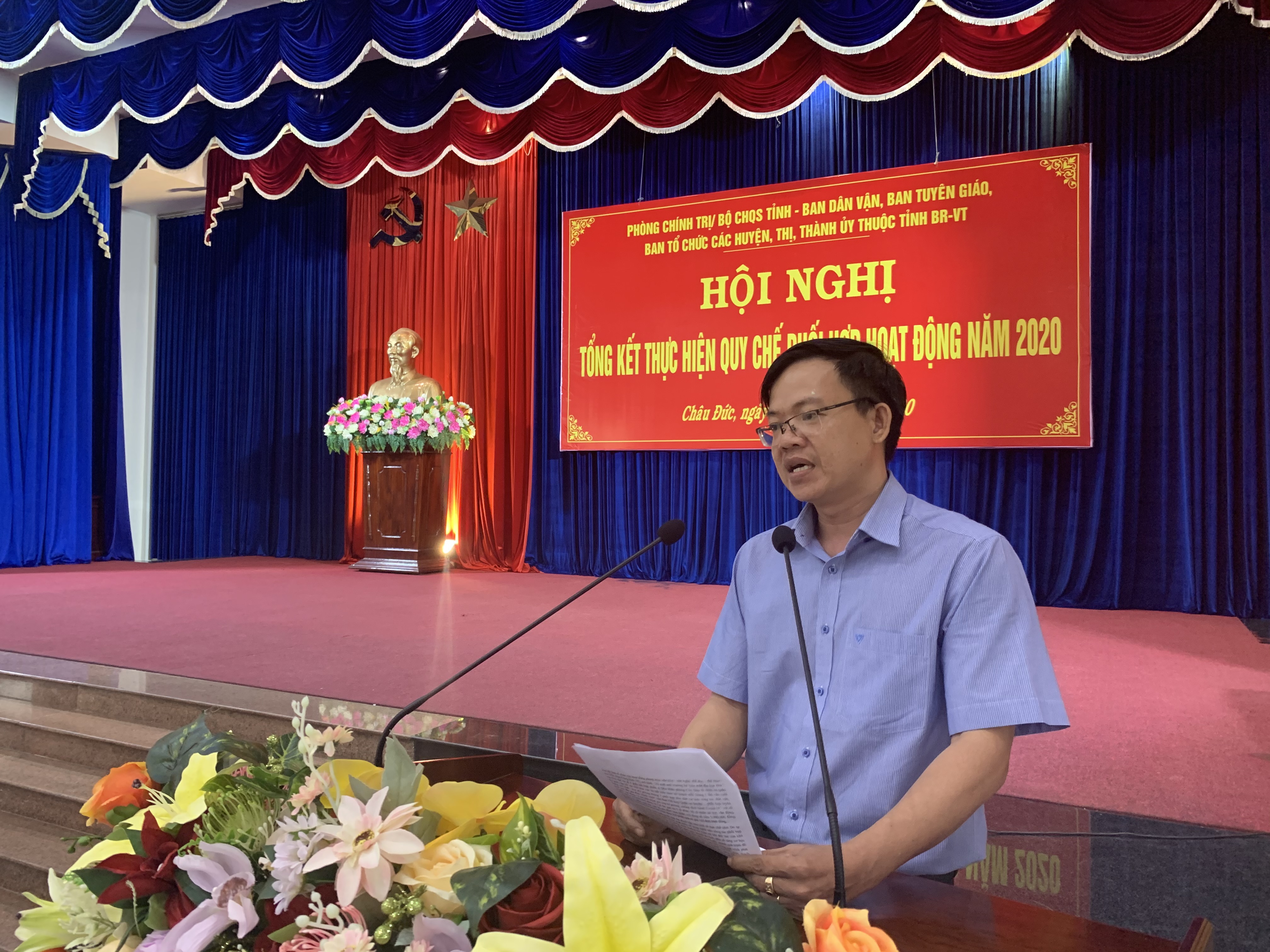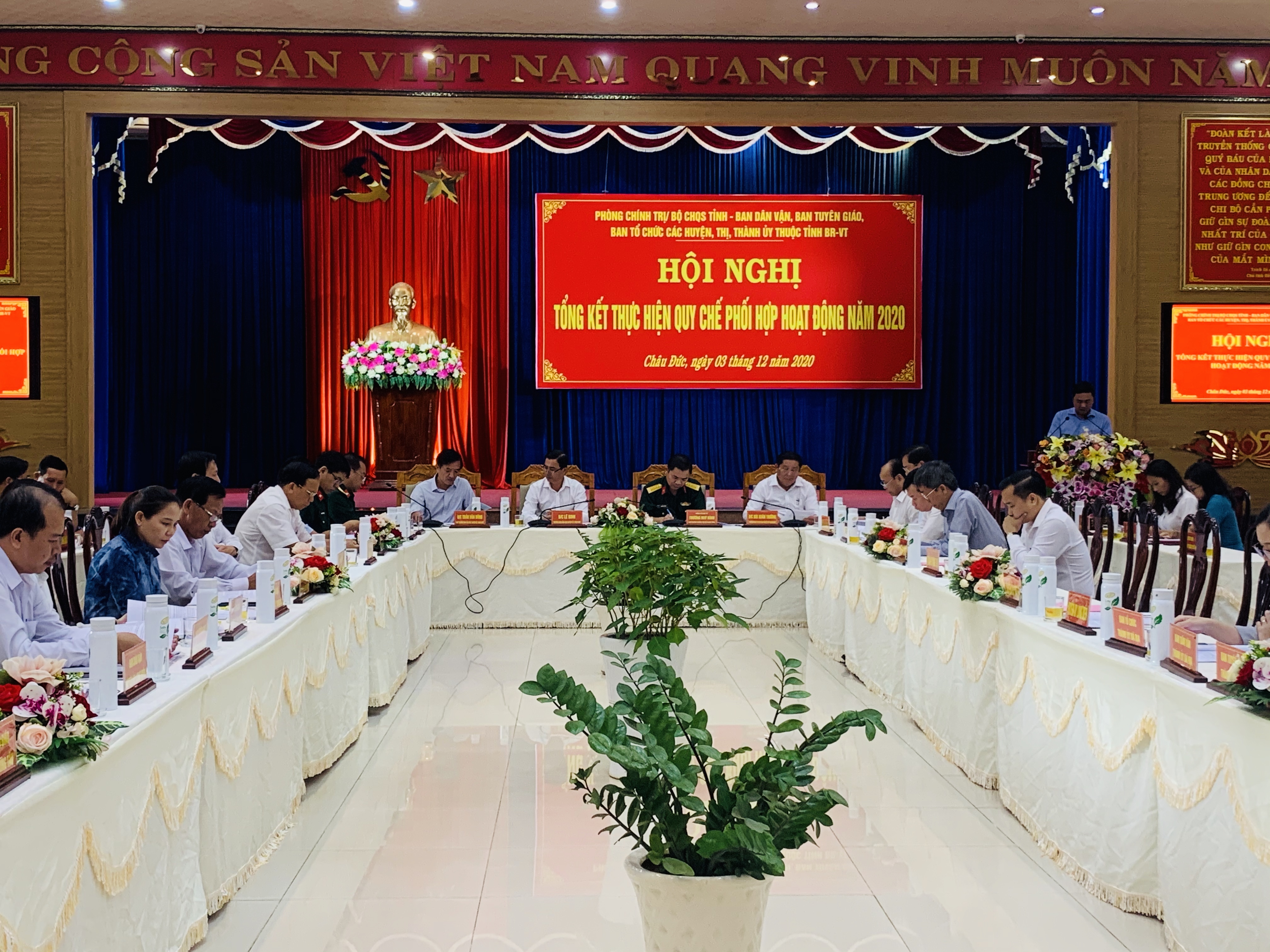 (QK7 Online) - Ngày 3/12, tại Huyện ủy Châu Đức, Bộ CHQS tỉnh Bà Rịa-Vũng Tàu tổ chức Hội nghị tổng kết thực hiện Quy chế phối hợp giữa Phòng Chính trị Bộ CHQS tỉnh với Ban Dân vận, Ban Tuyên giáo, Ban Tổ chức các Huyện ủy, Thị ủy, Thành ủy về công tác Dân vận, Tuyên giáo và Tổ chức xây dựng Đảng năm 2020.