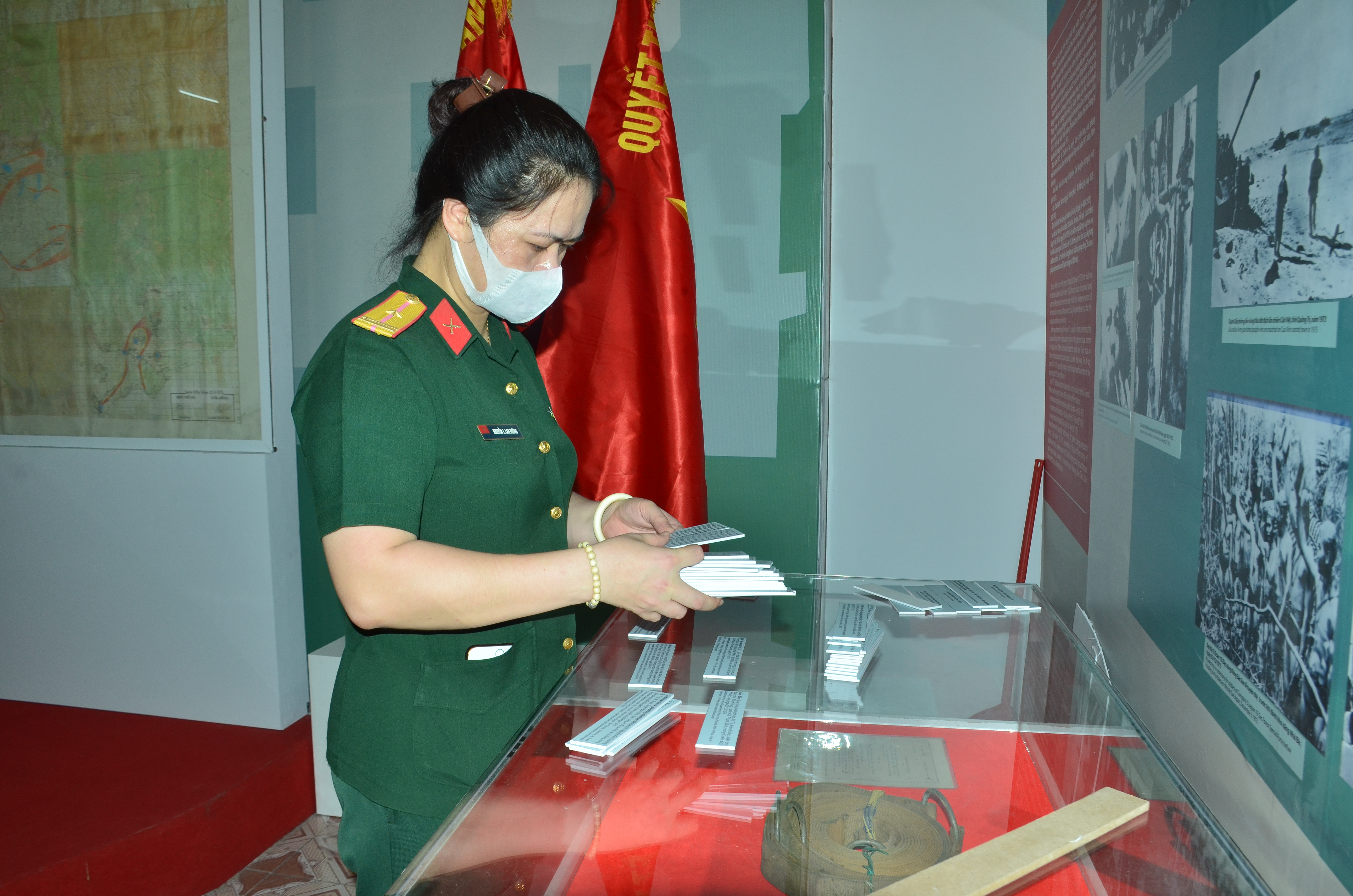 Thiếu tá chuyên nghiệp Nguyễn Thị Lan Hương kiểm tra chú thích các hiện vật