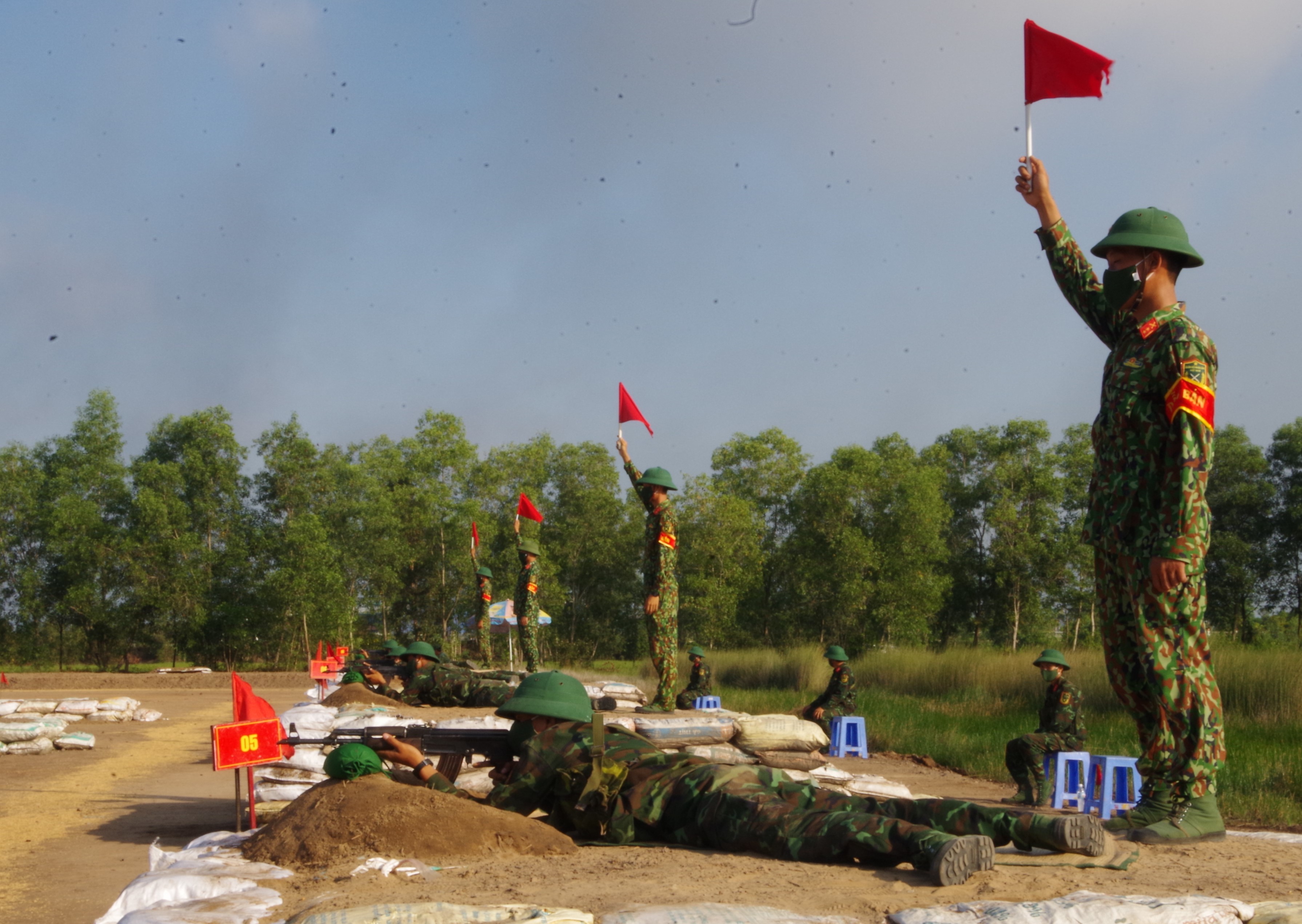 Các xạ thủ Tiểu đoàn 1, Bộ CHQS tỉnh Long An trên thao trường kiểm tra bắn đạn thật.