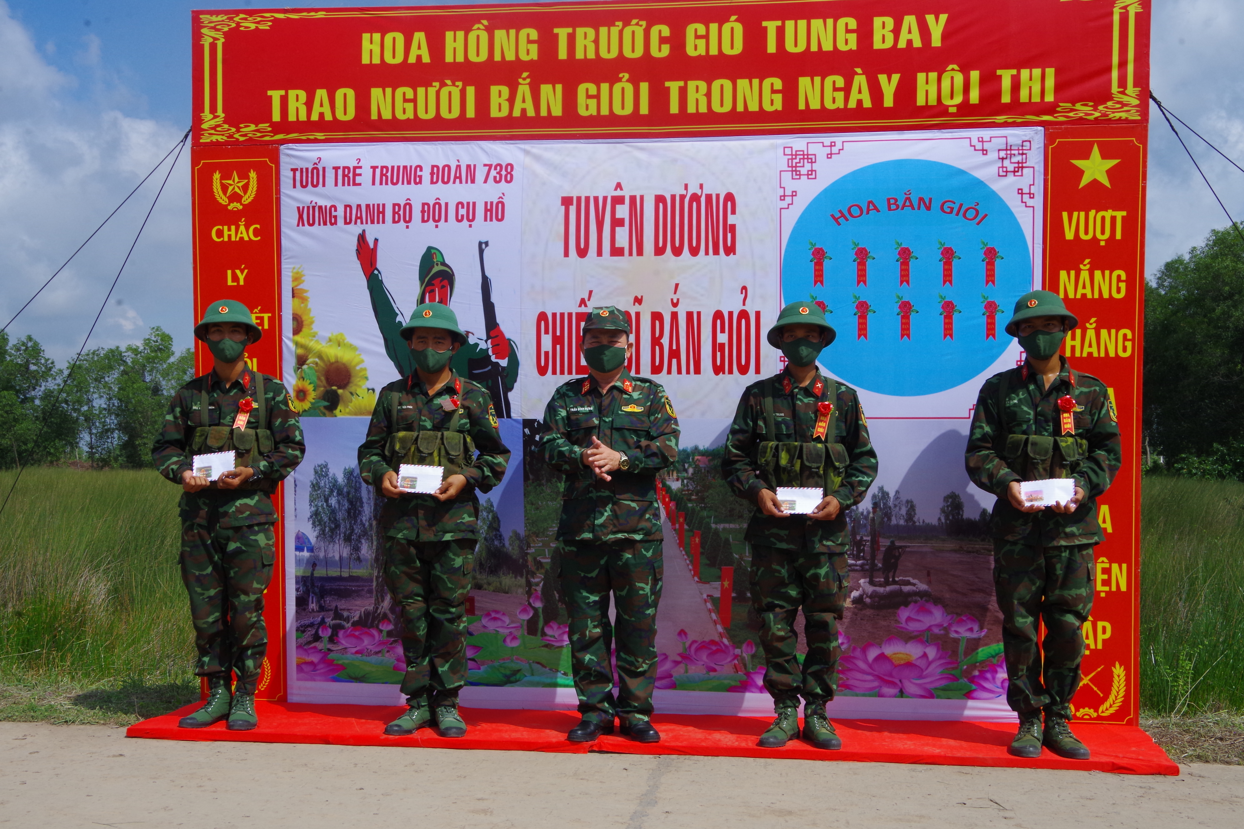 Đại tá Trần Đình Hưng, Phó Chỉ huy trưởng, Tham mưu trưởng Bộ CHQS tỉnh Long An trao thưởng chiến sĩ bắn giỏi.