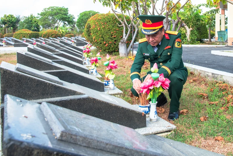 Đồng chí Phó Tư lệnh Quân khu thắp hương lên các phần mộ liệt sĩ.