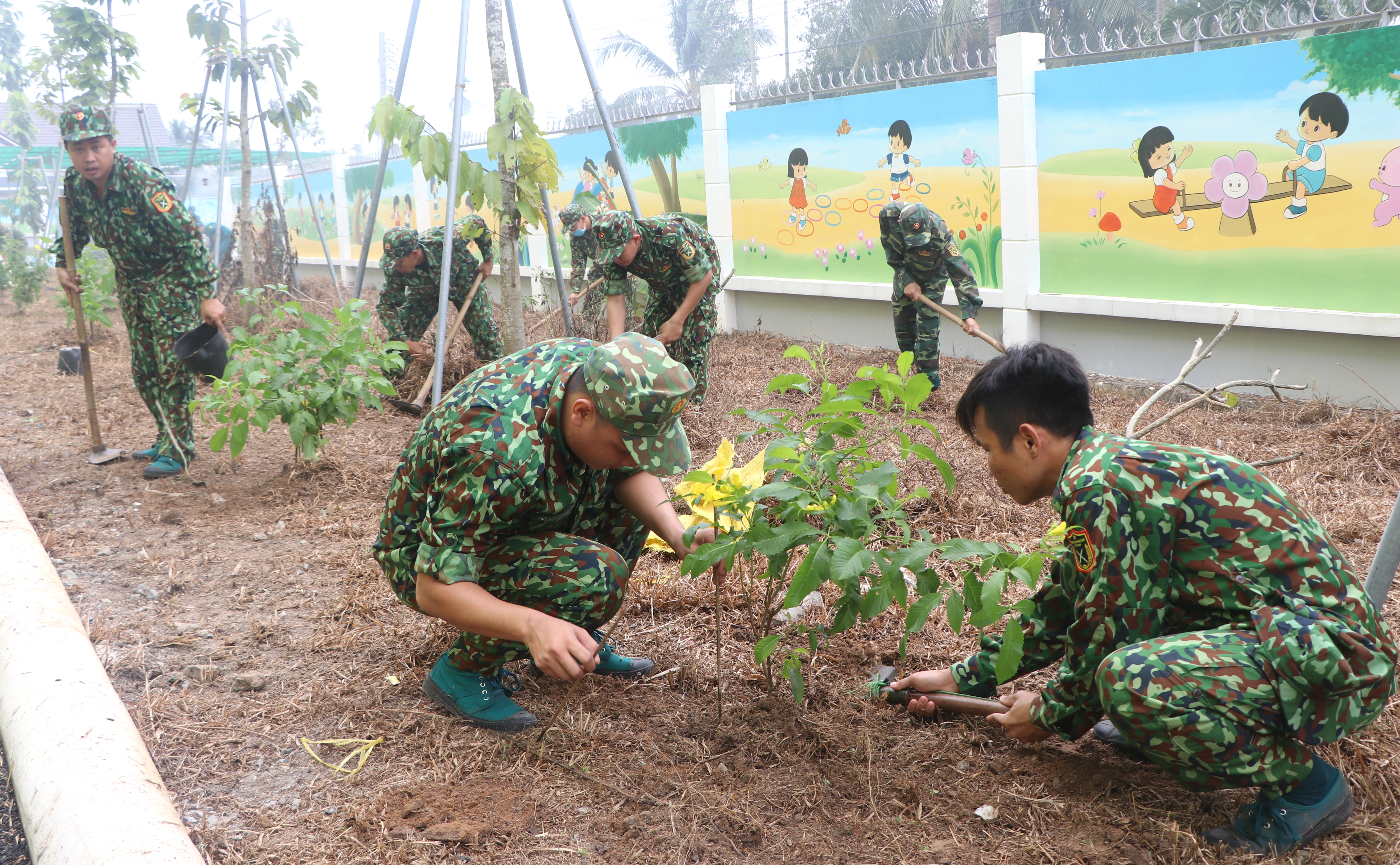 Cán bộ, chiến sĩ dọn cỏ, trồng cây tại Trường Mầm non Hoa Mai 3, xã An Sơn.