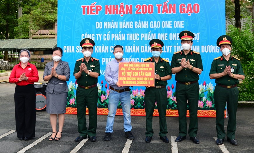 Tại buổi lễ, đại diện Công ty Cổ phần thực phẩm One One trao tặng Bộ CHQS tỉnh Bình Dương 200 tấn gạo. Đồng chí Trần Thị Kim Lan, Phó chủ tịch Ủy ban Mặt trận Tổ quốc Việt Nam tỉnh Bình Dương thay mặt cho địa phương trao thư cảm ơn đến doanh nghiệp tài trợ và Cục Dân quân tự vệ.