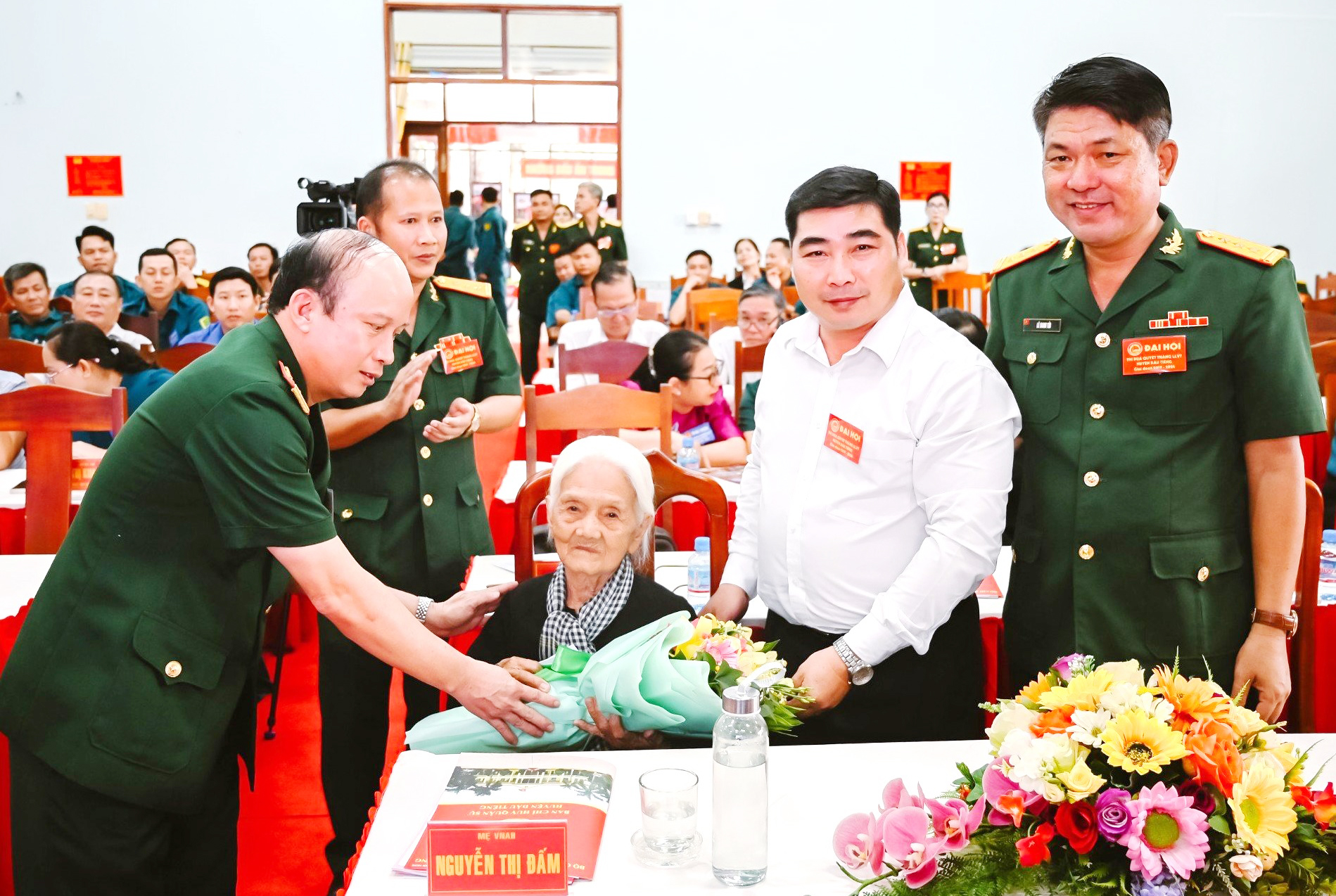 Đại tá Nguyễn Đình Chuẩn và lãnh đạo địa phương tặng hoa Mẹ Việt Nam anh hùng.