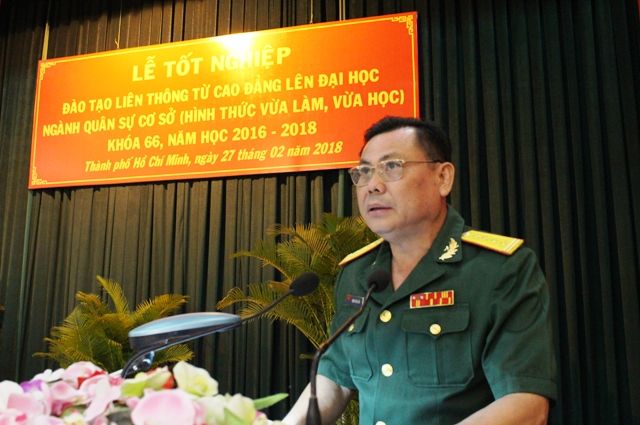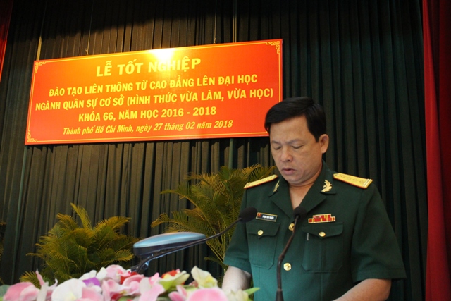 Đại tá Phạm Văn Thuận – Phó Tham mưu trưởng Quân khu 7 phát biểu tại lễ tốt nghiệp