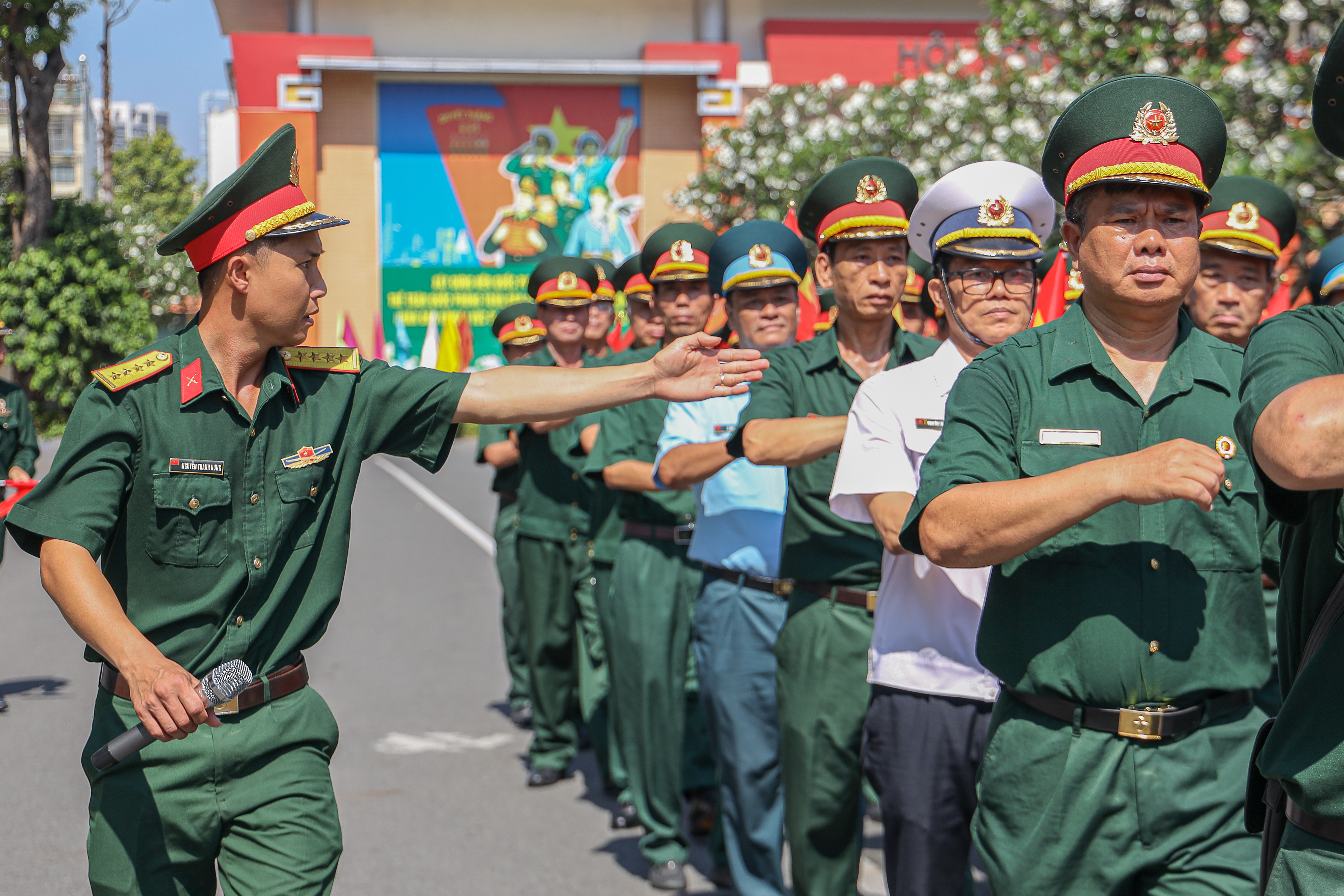 Đại úy Nguyễn Thanh Hưng, Ban Tác huấn, Phòng Tham mưu, Bộ Tư lệnh TPHCM với phong thái ân cần, từ tốn, kiên nhẫn hướng dẫn từng động tác cho các cựu chiến binh. Đồng chí không chỉ là người huấn luyện mà còn là người đồng hành, truyền lửa để mỗi bước diễu binh thêm vững vàng, tự hào.