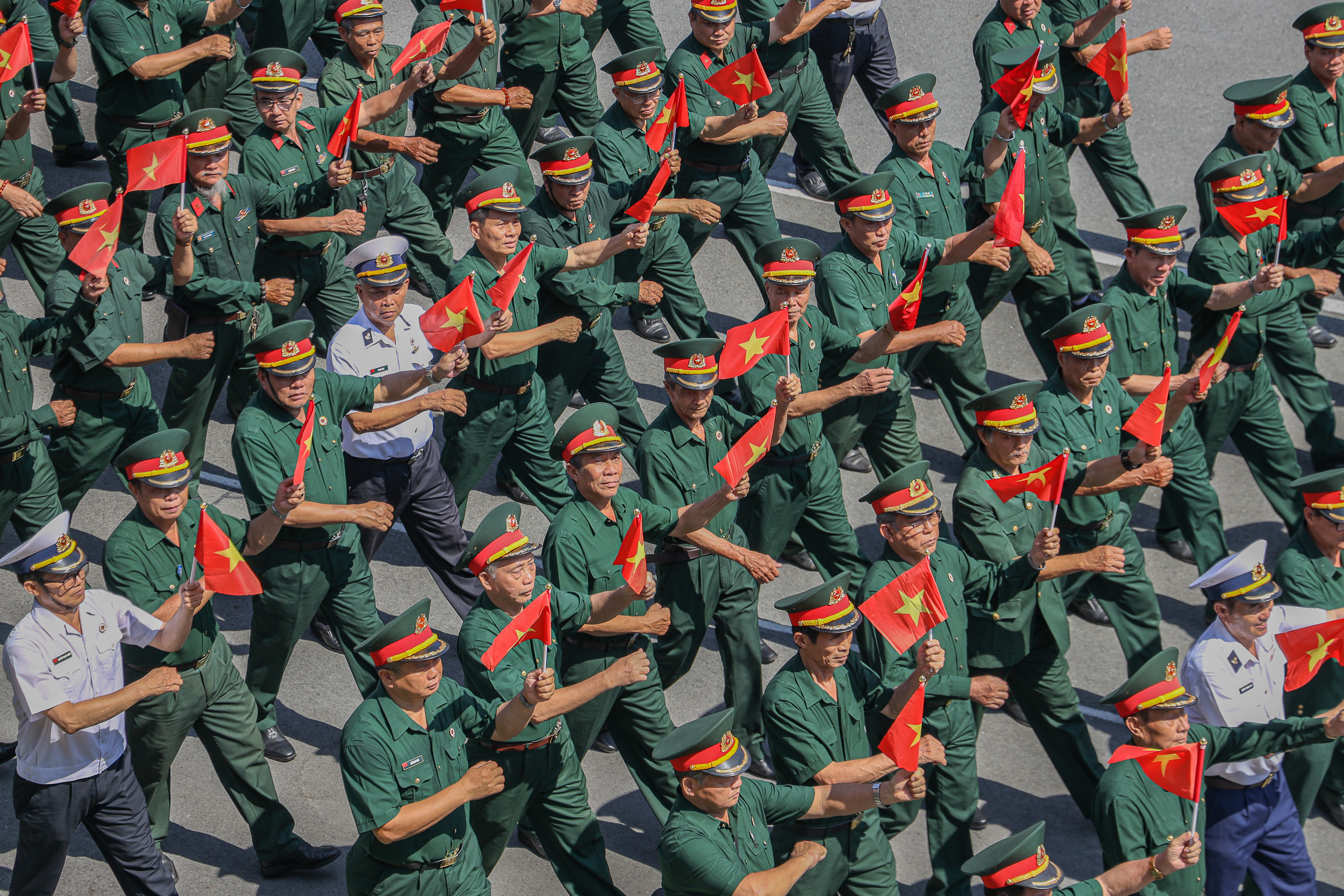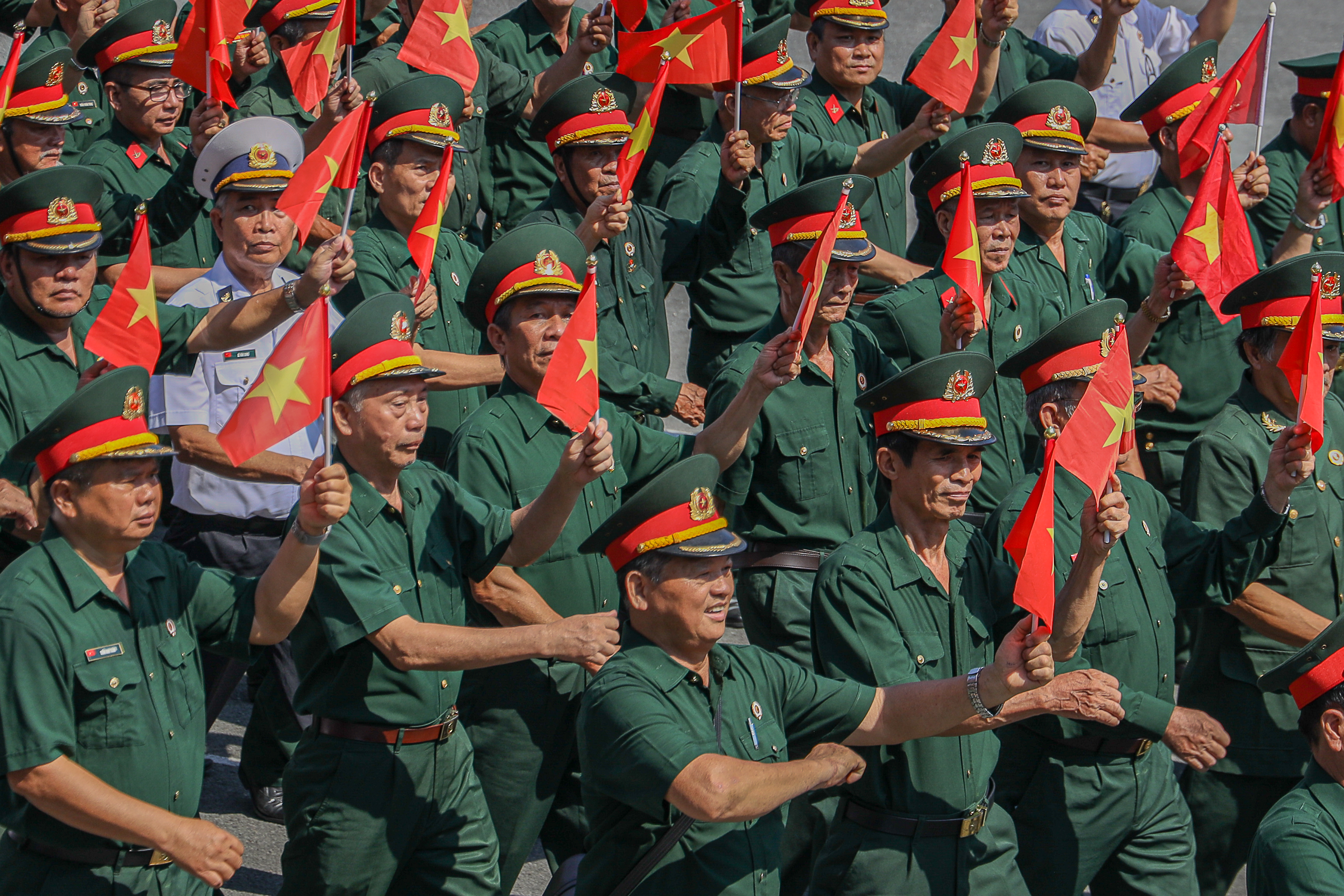 Cựu chiến binh Đỗ Văn Ngọc, 65 tuổi (đầu tiên bên trái), Hội Cựu chiến binh huyện Bình Chánh là chiến sĩ pháo binh của Sư đoàn 5 tham gia chiến đấu tại Campuchia (giai đoạn 1985-1988). "Được tham gia diễu binh là một niềm vinh dự, tự hào. Chính những giọt mồ hôi trên sân tập không làm ta mệt mỏi, mà ngược lại, biến thành niềm vui, sự hứng khởi và tiếp thêm sức mạnh", ông Ngọc tâm sự.