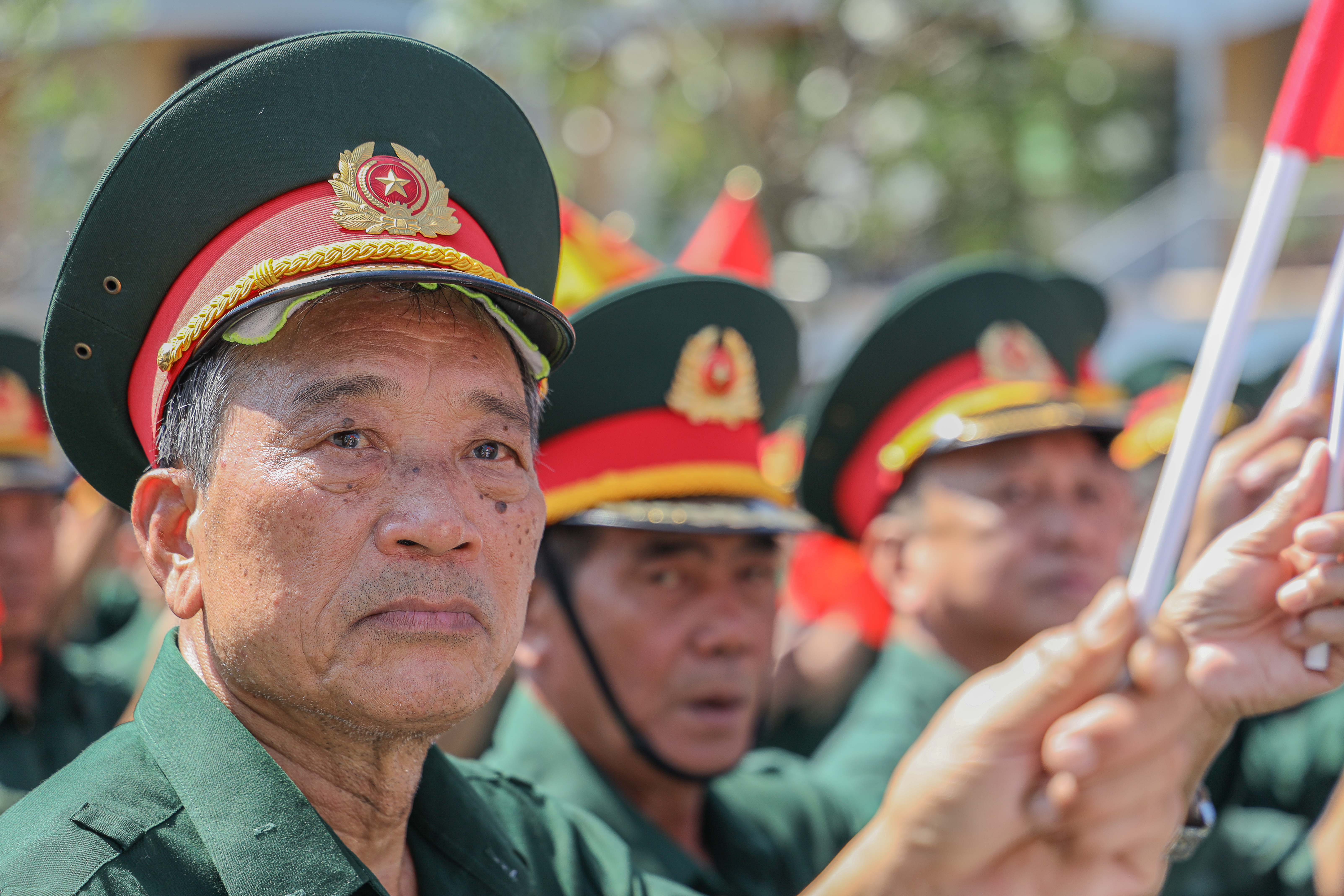 Một cựu chiến binh lấy ra một miếng khăn nhỏ, lặng lẽ lót dưới mũ để thấm mồ hôi.