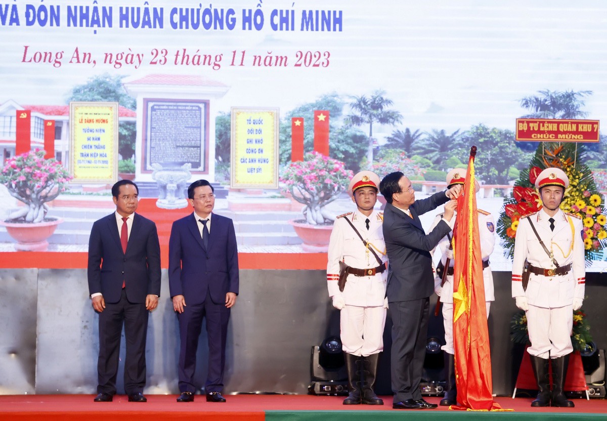 Đồng chí Võ Văn Thưởng, Ủy viên Bộ Chính trị, Chủ tịch nước Cộng hòa xã hội chủ nghĩa Việt Nam trao Huân chương Hồ Chí Minh cho tỉnh Long An.