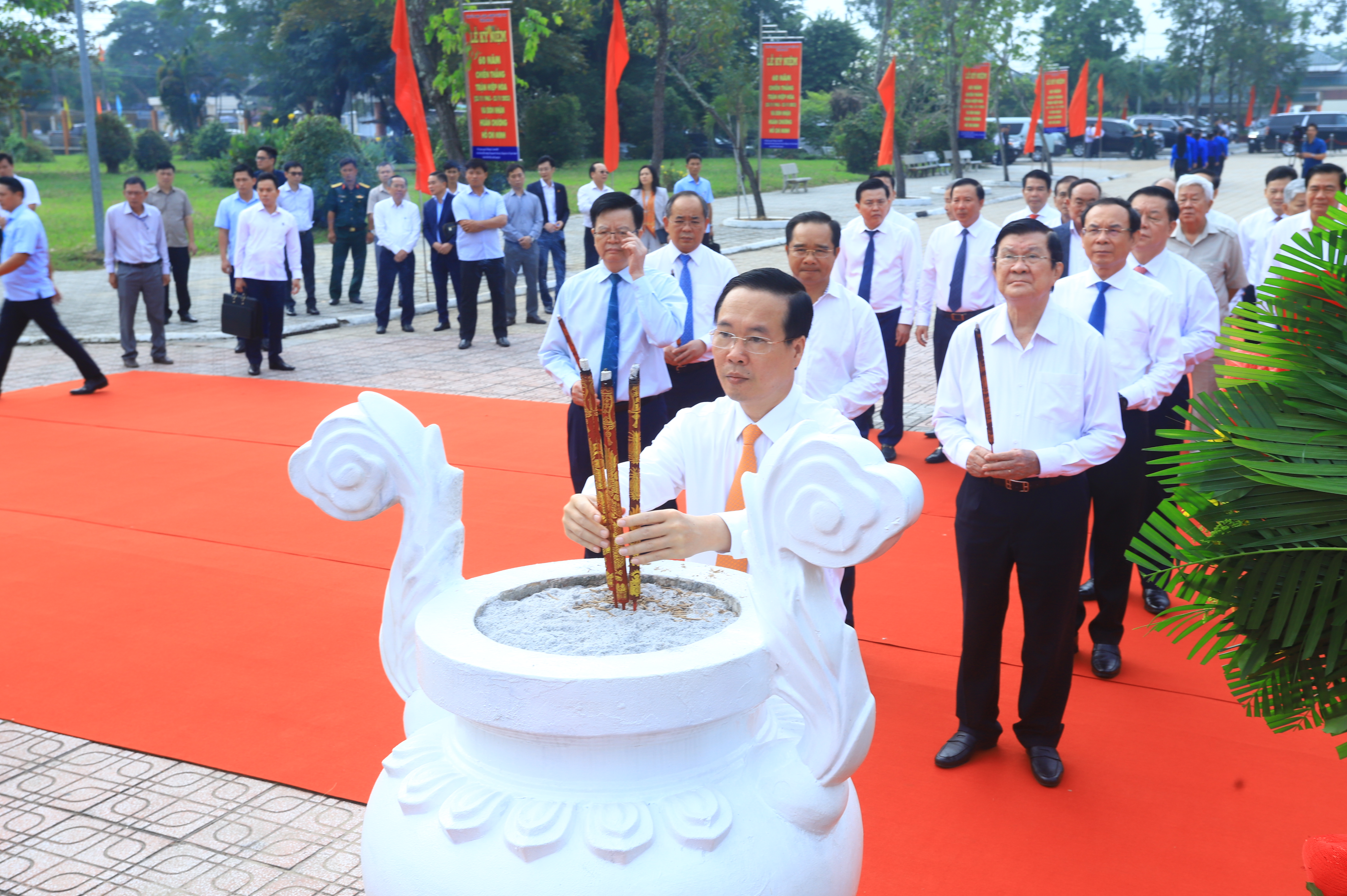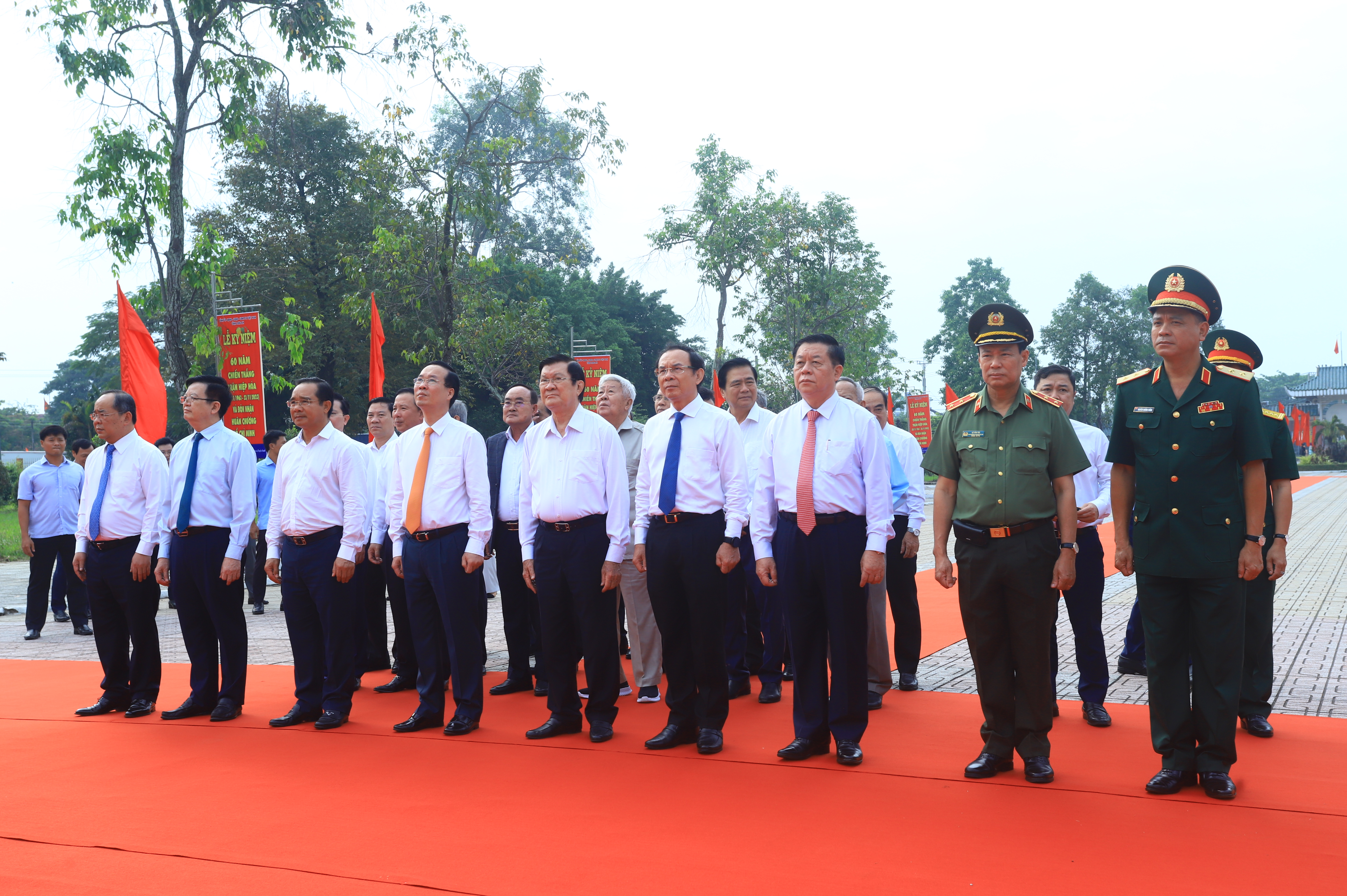 Đồng chí Võ Văn Thưởng, Ủy viên Bộ Chính trị, Chủ tịch nước Cộng hòa xã hội chủ nghĩa Việt Nam và các đại biểu dâng hương, dâng hoa tại Khu di tích Ngã tư Đức Hòa, tỉnh Long An. Ảnh: Duy Tình