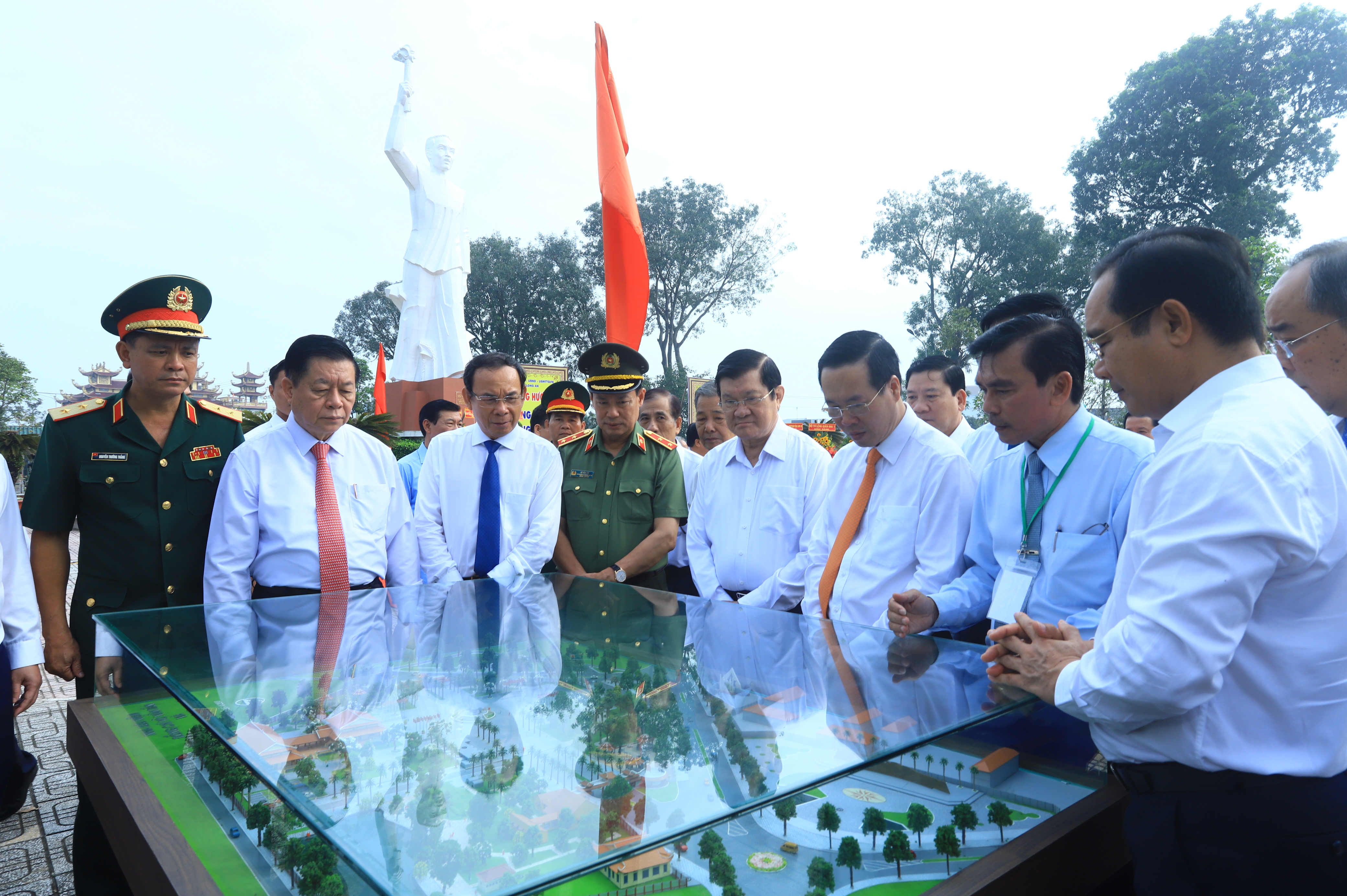 Đồng chí Võ Văn Thưởng, Ủy viên Bộ Chính trị, Chủ tịch nước Cộng hòa xã hội chủ nghĩa Việt Nam và các đại biểu tham quan mô hình Khu di tích Ngã tư Đức Hòa, tỉnh Long An. Ảnh: Duy Tình