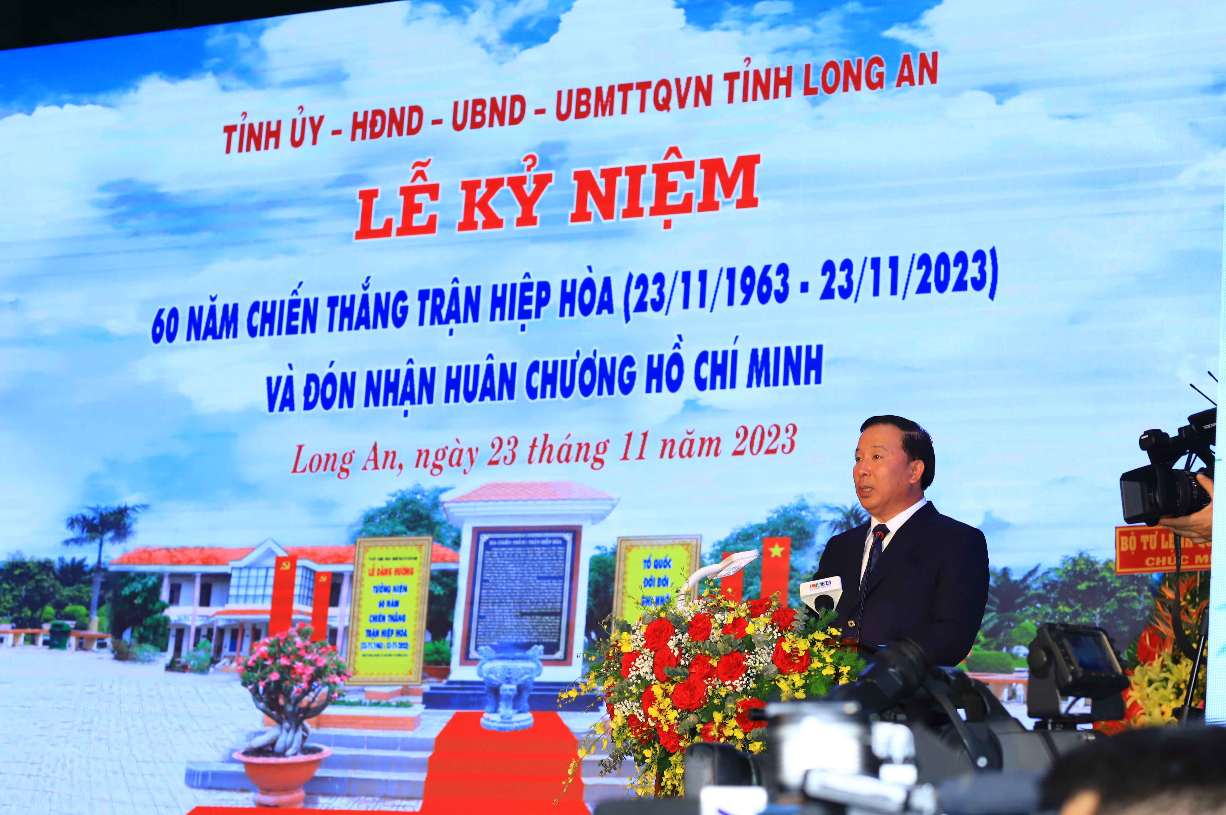 Tại buổi lễ, đồng chí Nguyễn Văn Út, Phó Bí thư Tỉnh ủy, Chủ tịch UBND tỉnh Long An đọc diễn văn ôn lại truyền thống vẻ vang của quân, dân và Đảng bộ tỉnh Long An trong chiến thắng Hiệp Hòa. Phát huy khí thế của phong trào Ðồng Khởi, vào những năm 1962-1963, Tỉnh ủy Long An đưa ra phương hướng chỉ đạo phá ấp chiến lược nhằm đánh bại âm mưu bình định của địch, với mục tiêu được chọn là căn cứ Hiệp Hòa, Trung tâm huấn luyện biệt kích Hiệp Hòa. Ðêm 22 rạng ngày 23-11-1963, lực lượng vũ trang Long An tiến hành trận đánh Hiệp Hòa mở đầu cao trào phá ấp chiến lược, giành chiến thắng hoàn toàn, bắt sống hơn 100 biệt kích, trong đó có bốn cố vấn Mỹ, thu hàng trăm súng các loại, mở đầu một chương oanh liệt trong lịch sử kháng chiến chống Mỹ, cứu nước của quân dân Long An, góp phần làm phá sản chiến lược "chiến tranh đặc biệt" của Mỹ.