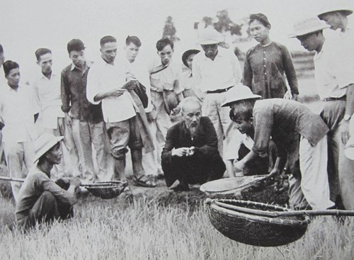 Chủ tịch Hồ Chí Minh thăm Hợp tác xã nông nghiệp Tân Lập, huyện Quốc Oai, tỉnh Hà Tây (nay là TP Hà Nội), tháng 7-1958. Ảnh tư liệu