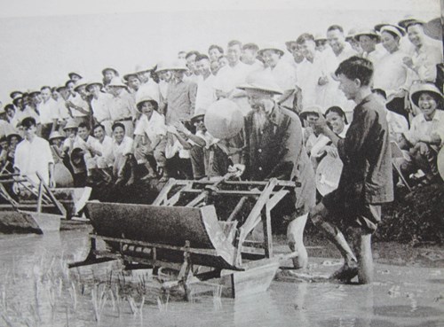 Chủ tịch Hồ Chí Minh dùng thử máy cấy lúa cải tiến tại Trại thí nghiệm trồng lúa, Sở Nông lâm Hà Nội (tháng 7-1960). Ảnh tư liệu