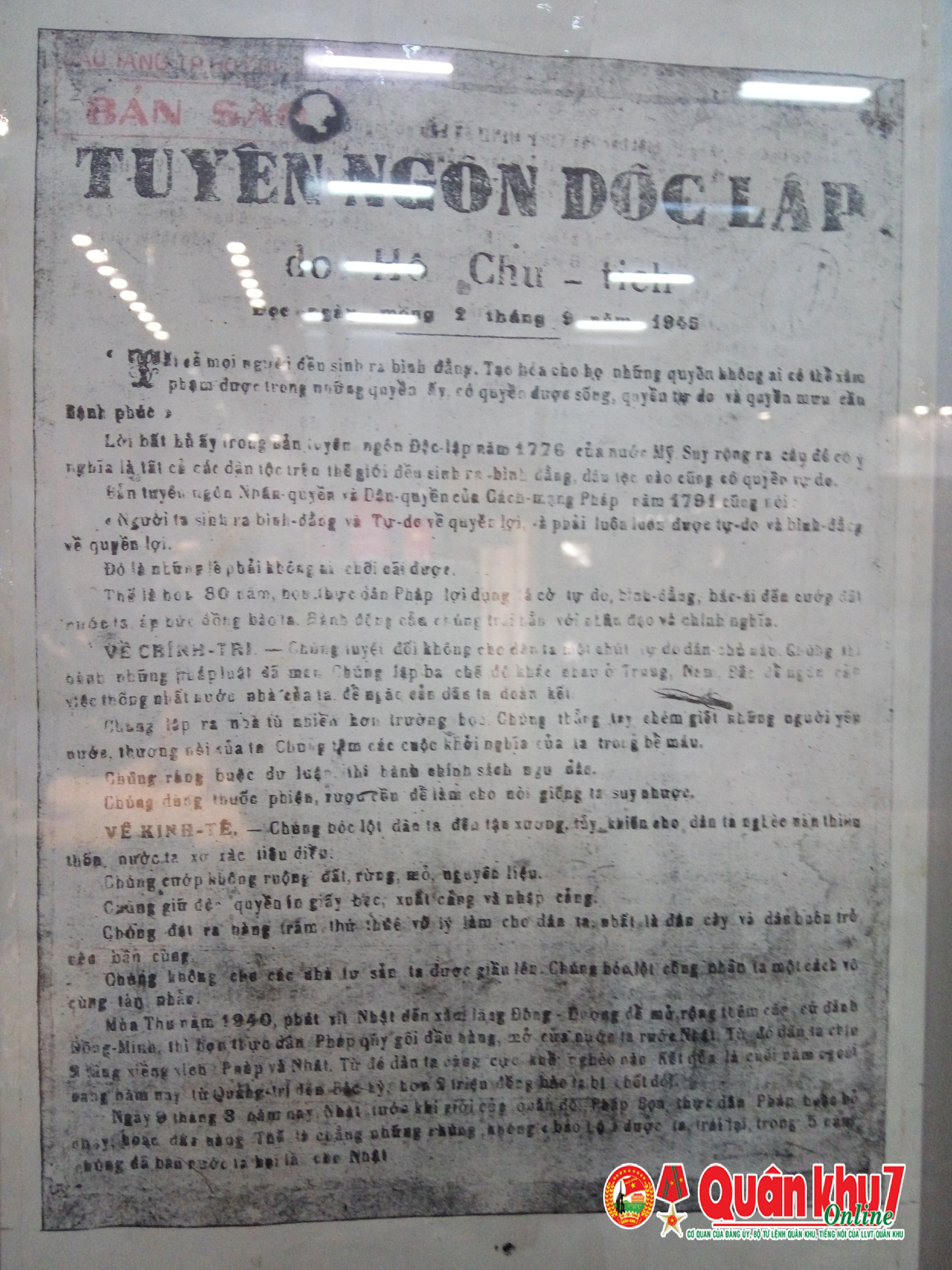 Bản sao Tuyên ngôn Độc lập của Chủ tịch Hồ Chí Minh đọc tại Quảng trường Ba Đình lịch sử ngày 02.9.1945 được trưng bày tại Bảo tàng TP Hồ Chí Minh
