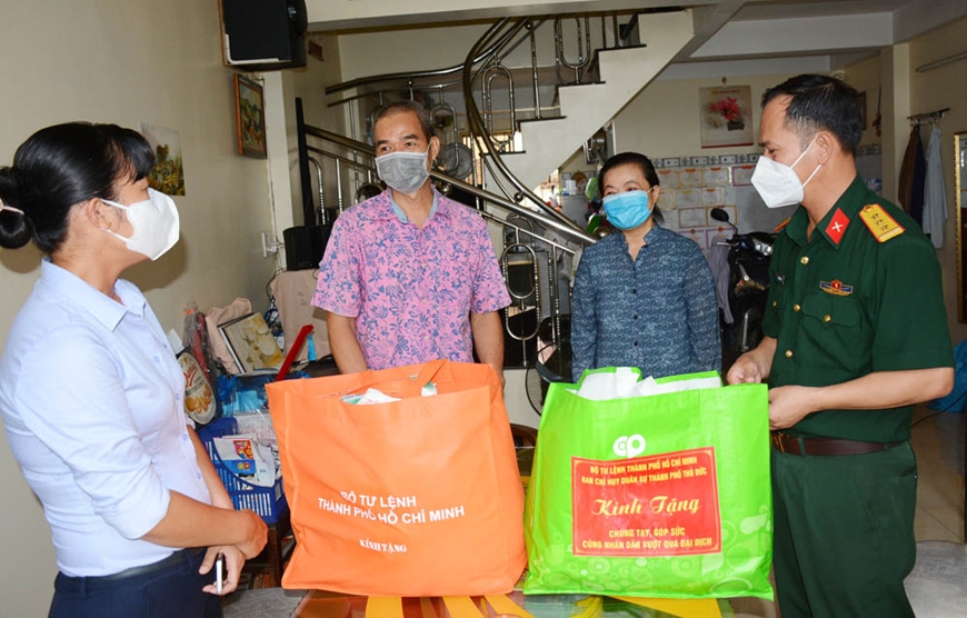 Đối với những gia đình có con đang thực hiện nghĩa vụ quân sự tại các đơn vị thuộc Quân khu 7, Quân đoàn 4, Ban CHQS TP Thủ Đức cử cán bộ đến tận nhà thăm, nắm tình hình, động viên và trao quà hỗ trợ, thực hiện tốt chính sách hậu phương quân đội để các chiến sĩ yên tâm huấn luyện, sẵn sàng chiến đấu và tham gia chống dịch. Ông Vũ Tường Duy, ngụ tại khu phố 2, phường Phú Hữu, thân sinh của chiến sĩ Vũ Anh Hào, đang huấn luyện tại Sư đoàn 9 (Quân đoàn 4), bày tỏ: “Dịch bệnh kéo dài, gia đình tôi gặp không ít khó khăn. Thế nhưng, chúng tôi luôn được sự quan tâm chu đáo của Ban CHQS TP Thủ Đức cùng cấp ủy, chính quyền địa phương. Các đồng chí thăm hỏi sức khỏe, động viên tinh thần, kịp thời hỗ trợ nhu yếu phẩm, khẩu trang, nước sát khuẩn… Chúng tôi chân thành cảm ơn cán bộ, chiến sĩ LLVT TP Thủ Đức và địa phương đã giúp đỡ chúng tôi ổn định cuộc sống trong lúc dịch bệnh khó khăn”.