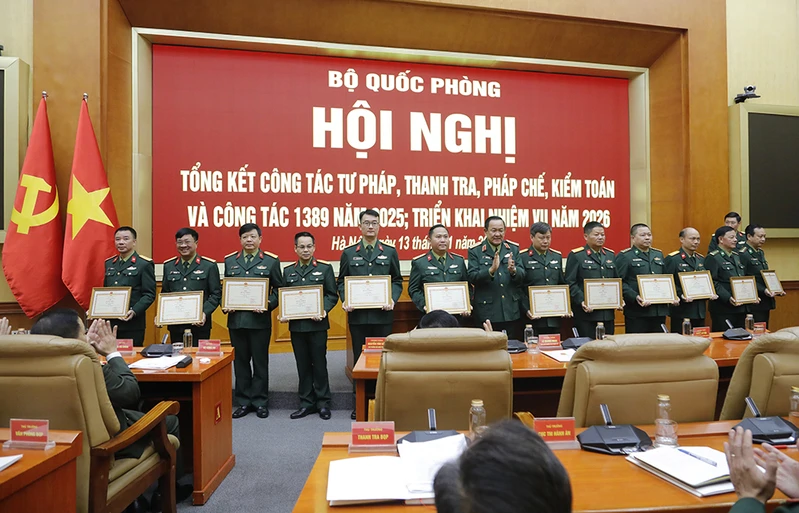 Hội nghị đã công bố và trao quyết định khen thưởng của Bộ trưởng Bộ Quốc phòng cho 25 tập thể và 38 cá nhân có thành tích xuất sắc trong công tác tư pháp, thanh tra, pháp chế, kiểm toán và công tác 1389 năm 2025.