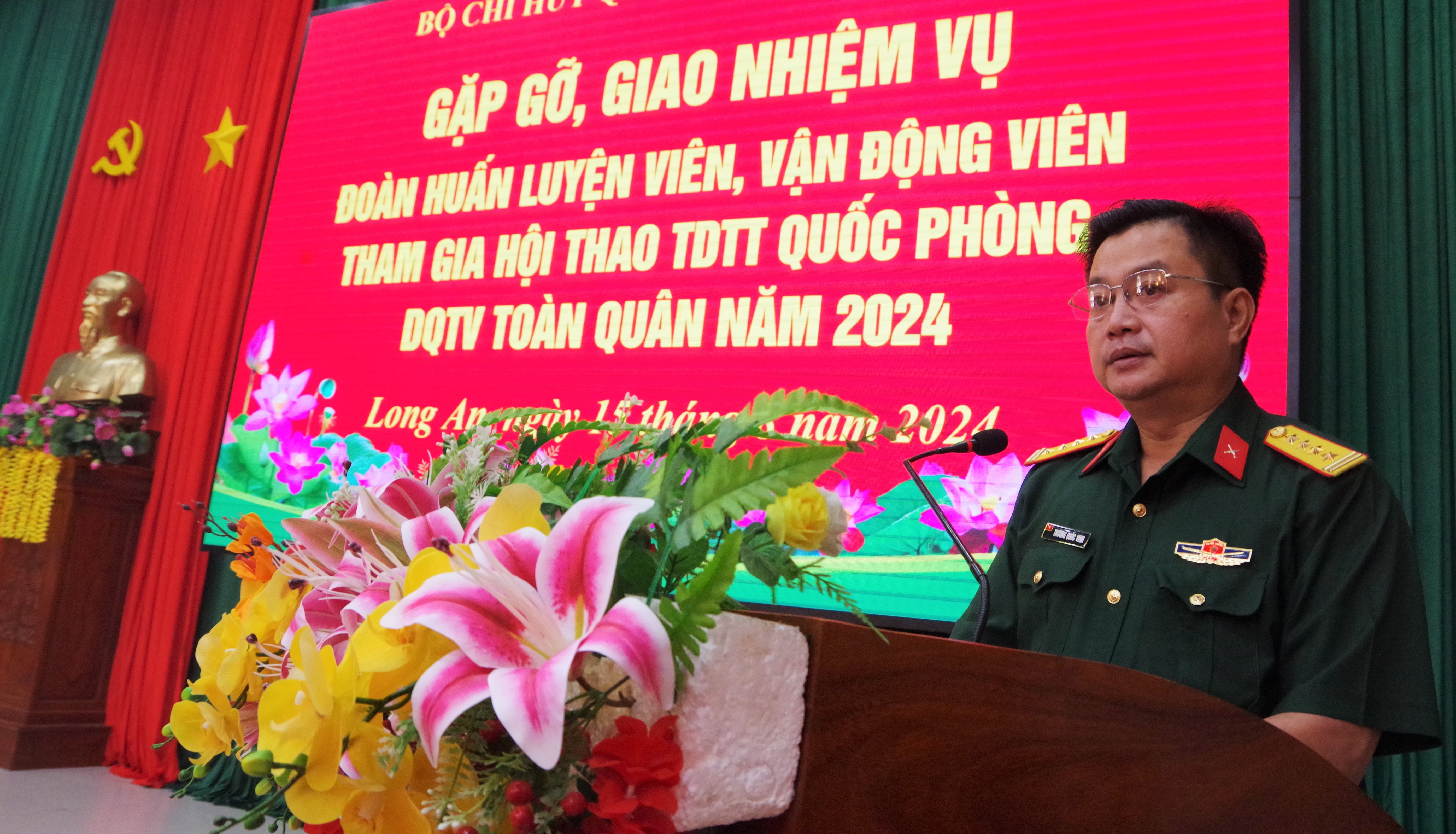 Đại tá Trương Quốc Vinh, Phó Chỉ huy trưởng Bộ CHQS tỉnh phát biểu giao nhiệm vụ.
