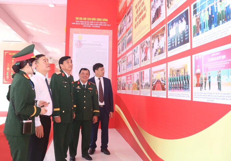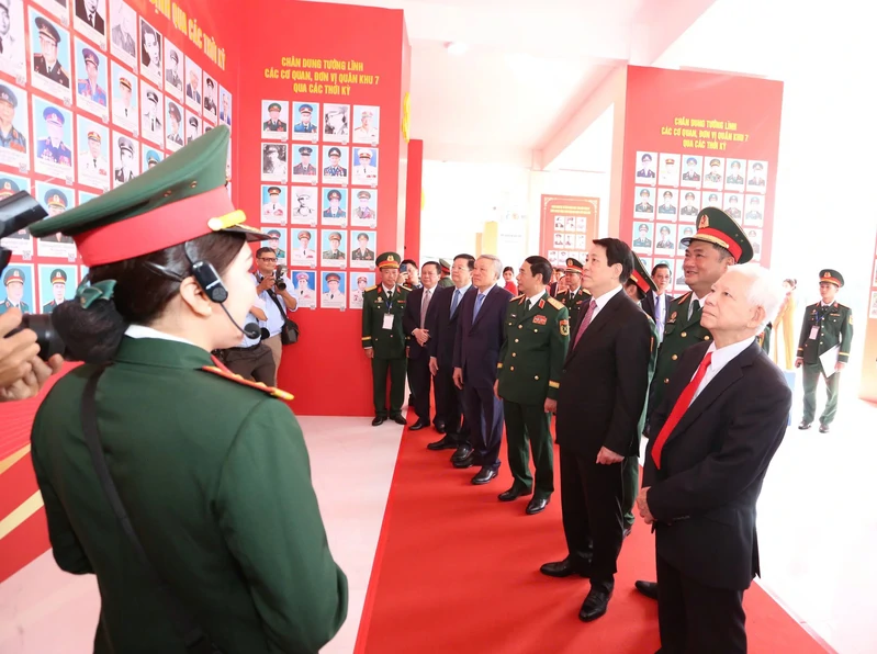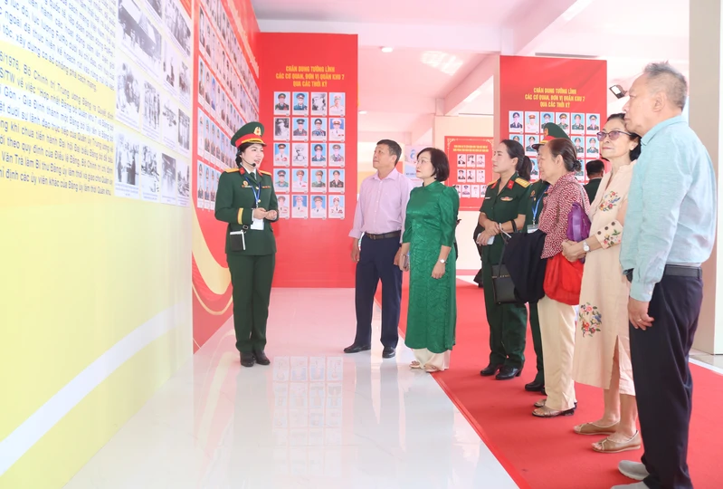 Thiếu tướng Võ Văn Thi, nguyên Phó Tư lệnh Quân khu; Đại tá Nguyễn Thanh Tâm, Chủ nhiệm Hậu cần-Kỹ thuật Quân khu và đại biểu tham quan các hình ảnh hoạt động của LLVT Quân khu.