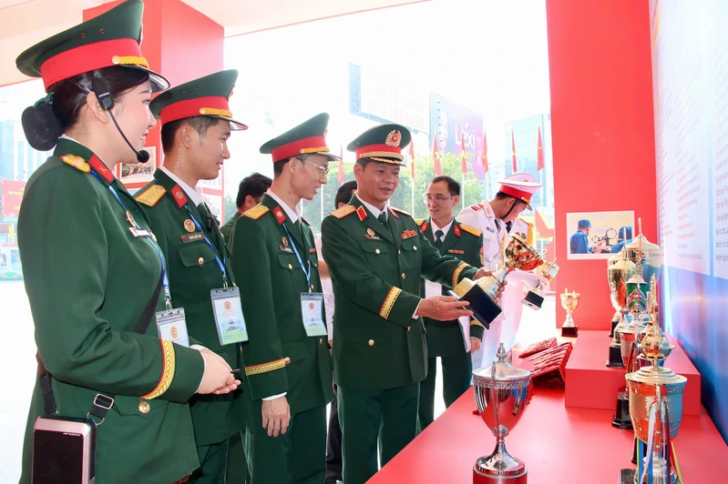 Thiếu tướng Lê Ngọc Hải, Phó Tham mưu trưởng Quân khu tham quan khu trưng bày các phần thưởng cao quý của LLVT Quân khu.
