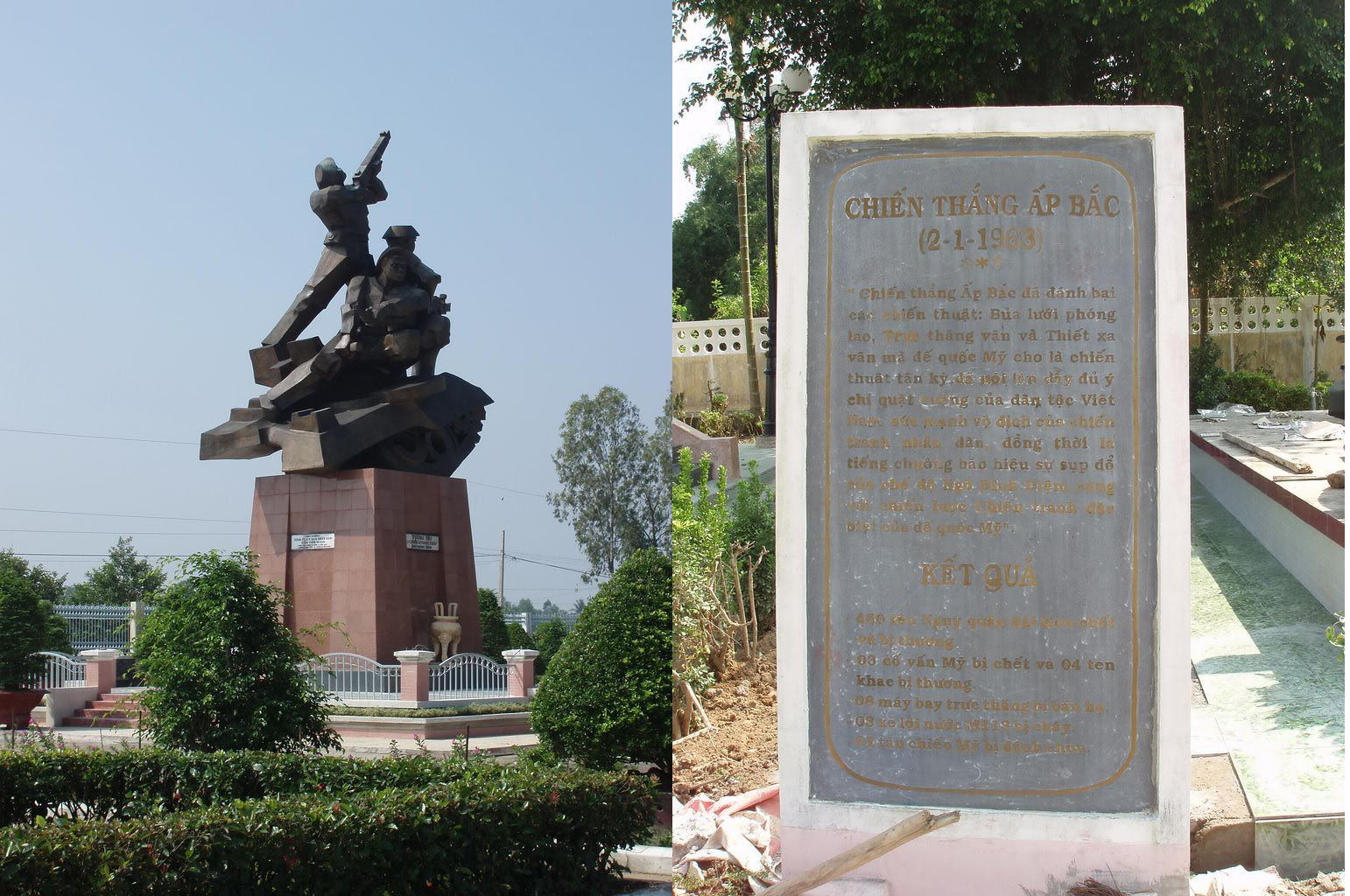 Từ tấm bia này, chúng tôi có dịp tìm hiểu về trận Ấp Bắc để biết thêm về lịch sử truyền thống đấu tranh cách mạng của quân và dân nơi đây trong những năm kháng chiến chống Mỹ ác liệt. Sáng sớm ngày 02/01/1963, khi Tỉnh ủy đang họp tại xã Hưng Thạnh (thuộc huyện Tân Phước, Tiền Giang ngày nay) thì được tin địch mở cuộc càn quét do Bộ Tư lệnh sư đoàn 7 và chiến đoàn bảo an thuộc tiểu khu Định Tường đảm trách. Cuộc càn quét diễn ra trong phạm vi xã Tân Phú (thuộc vùng giải phóng liên hoàn nối liền hai huyện Cai Lậy-Châu Thành, tiếp giáp vùng căn cứ của tỉnh) để vây diệt trung đội địa phương của ta mà chúng phát hiện đang trú quân tại đó. Điểm cụ thể mà chúng đổ quân bao vây diệt lực lượng ta là Ấp Bắc. Lực lượng của ta chỉ có Đại đội 1 Tiểu đoàn 514 và Đại đội 1 Tiểu đoàn 261. Năm giờ sáng ngày 02/1/1963, Tiểu đoàn A của địch chia làm 2 cánh tiến vào Ấp Bắc bị ta chặn đánh buộc chúng phải gọi tăng viện. Cùng thời gian này, trận địa công binh của ta dùng thủy lôi đánh chìm một tàu tại Vàm kinh 3 và bắn hỏng 2 chiếc khác. Đến 9h30 bọn chúng đã cho trực thăng đổ bộ xuống Ấp Bắc.