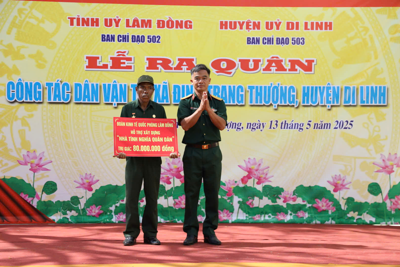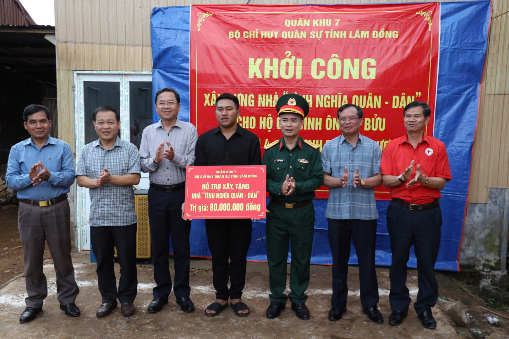 Đại tá Nguyễn Văn Sơn, Chính ủy Bộ CHQS tỉnh, đồng chí Tôn Thiện Đồng, Trưởng Ban Tuyên giáo và Dân vận tỉnh ủy và đại biểu chụp ảnh lưu niệm trong lễ khởi công xây dựng nhà "tình nghĩa quân - dân" cho anh K' Bửu là quân dân dự bị có hoàn cảnh khó khăn. Hội Chữ thập đỏ tỉnh tặng quà cho Nhân dân xã Đinh Trang Thượng. Đoàn Kinh tế - Quốc phòng Lâm Đồng hỗ trợ kinh phí xây dựng "nhà tình nghĩa quân - dân".