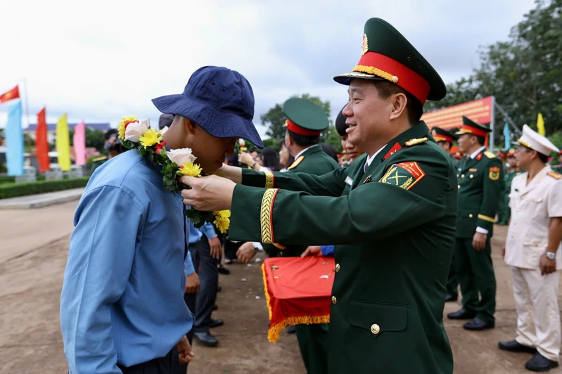 Thiếu tướng Đoàn Quang Hòa, Cục trưởng Cục Chính sách xã hội, Tổng cục Chính trị Quân đội Nhân dân Việt Nam, Chánh văn phòng Ban Chỉ đạo quốc gia 515 tặng hoa, trao quà động viên cán bộ, chiến sĩ các đội K chuẩn bị thực hiện nhiệm vụ tại Campuchia.