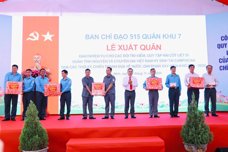 (QK7 Online) - Sáng 6/11, tại Nghĩa trang liệt sĩ Đồi 82, tỉnh Tây Ninh, Ban Chỉ đạo 515 Quân khu 7 tổ chức Lễ xuất quân giao nhiệm vụ cho các đội tìm kiếm, quy tập hài cốt liệt sĩ (đội K) Quân tình nguyện và chuyên gia Việt Nam hy sinh tại Campuchia qua các thời kỳ chiến tranh đưa về nước giai đoạn XXV (mùa khô 2025-2026). Thiếu tướng Trần Chí Tâm, Phó Chính ủy Quân khu, Trưởng ban Ban Chỉ đạo 515 Quân khu 7 chủ trì buổi lễ.