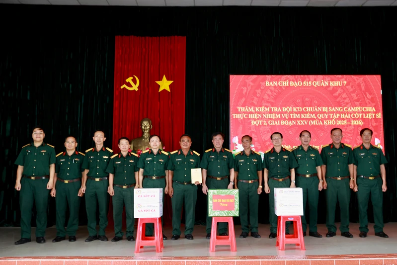 Dịp này, Đoàn công tác Ban Chỉ đạo 515 Quân khu 7 đã tặng quà, động viên cán bộ, chiến sĩ Đội K73, mong muốn đơn vị tiếp tục phát huy truyền thống, hoàn thành xuất sắc nhiệm vụ tìm kiếm, quy tập hài cốt liệt sĩ trong thời gian tới.