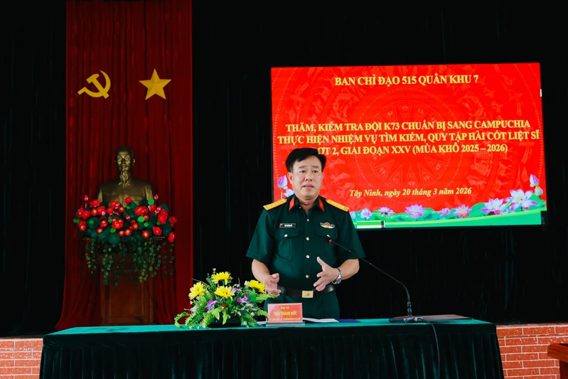 (QK7 Online) – Sáng 20/3, Đoàn công tác Ban Chỉ đạo 515 Quân khu 7 do Đại tá Thái Thành Đức, Phó Chủ nhiệm Chính trị Quân khu, Phó Trưởng Ban Chỉ đạo 515 Quân khu làm trưởng đoàn đã đến thăm, động viên cán bộ, chiến sĩ Đội K73 (Bộ CHQS tỉnh Tây Ninh) trước khi lên đường thực hiện nhiệm vụ tìm kiếm, quy tập hài cốt liệt sĩ quân tình nguyện và chuyên gia Việt Nam hy sinh tại Campuchia trong các thời kỳ chiến tranh, đợt 2, giai đoạn XXV (mùa khô 2025 – 2026).