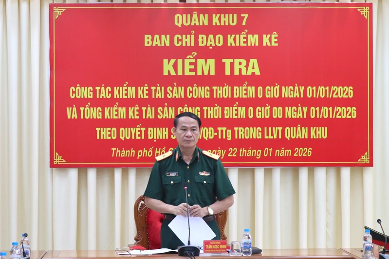 (QK7 Online) - Sáng 22/1, Đoàn công tác Quân khu 7 do Thiếu tướng Trần Ngọc Minh, Phó Tư lệnh Quân khu, Trưởng Ban Chỉ đạo kiểm kê Quân khu làm trưởng đoàn kiểm tra công tác kiểm kê tài sản công thời điểm 0 giờ ngày 01/01/2026 tại Lữ đoàn 77.