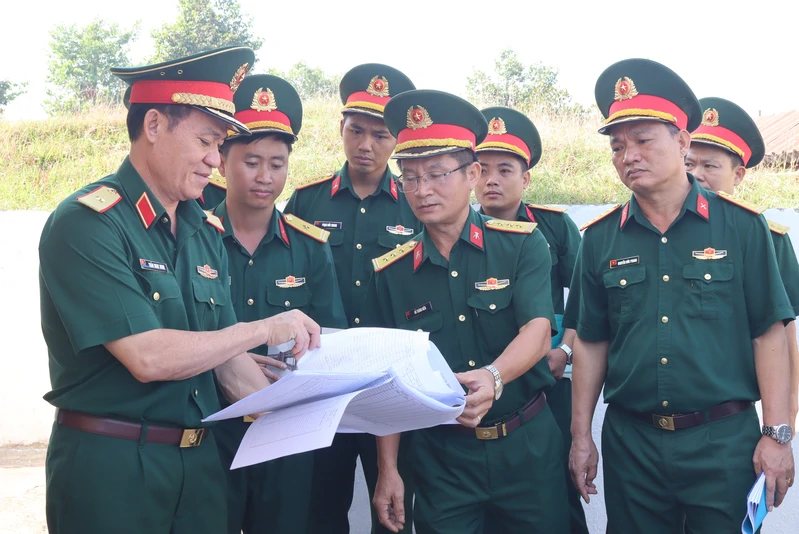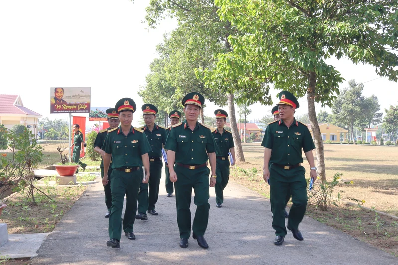 Thiếu tướng Trần Đức Thắng, Phó Chủ nhiệm Chính trị Quân khu, Phó trưởng Ban Chỉ đạo kiểm kê Quân khu (bìa trái) và đoàn công tác dự buổi kiểm tra.