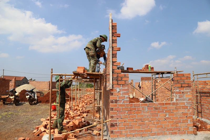 Cán bộ, chiến sĩ LLVT tỉnh Lâm Đồng tích cực khắc phục khó khăn xây dựng nhà cho người dân.