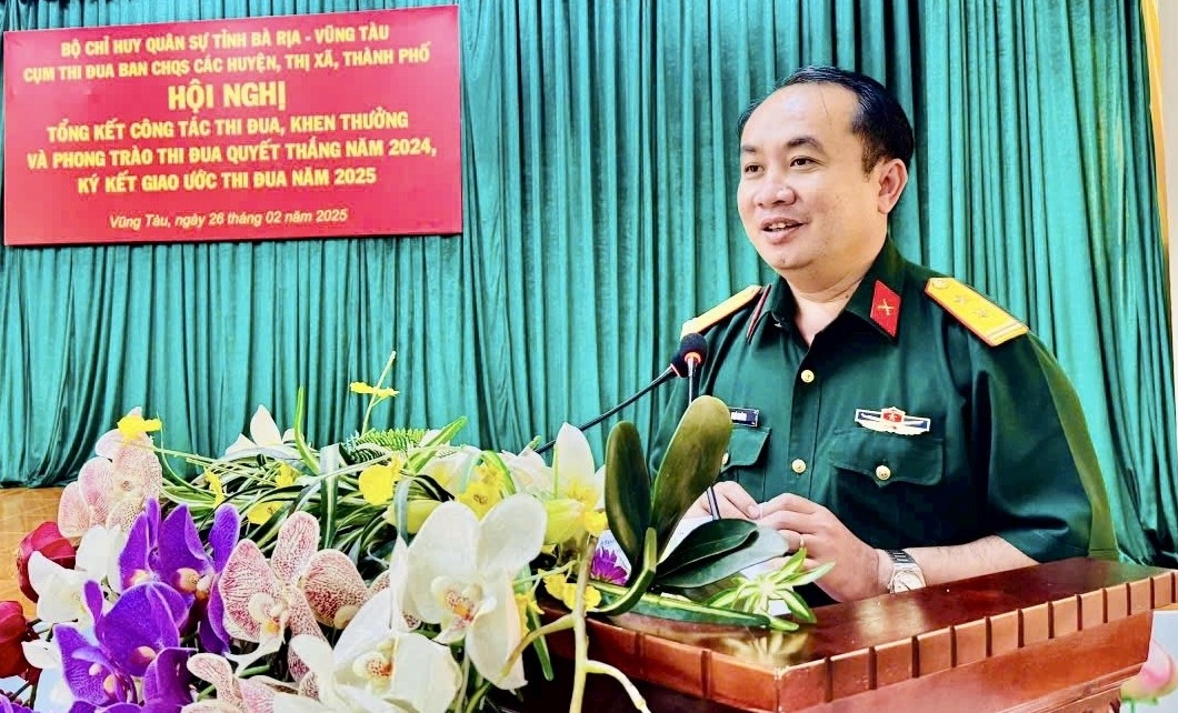 (QK7 Online) - Tại Ban Chỉ huy quân sự thành phố Vũng Tàu, Cụm thi đua Ban Chỉ huy quân sự các huyện, thị xã, thành phố trực thuộc Bộ Chỉ huy quân sự tỉnh Bà Rịa - Vũng Tàu tổ chức hội nghị Tổng kết công tác thi đua khen thưởng và phong trào thi đua quyết thắng năm 2024, ký kết giao ước thi đua năm 2025. Trung tá Ngô Khánh, Chính ủy Bộ Chỉ huy quân sự tỉnh dự và chỉ đạo hội nghị.
