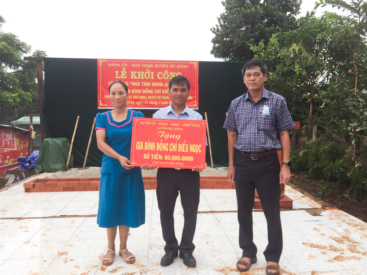 Căn nhà của đồng chí Điểu Ngọc được xây dựng trên diện tích rộng gần 130 m2, chi phi xây dựng khoảng 200 triệu đồng, trong đó Ban CHQS huyện Bù Đăng hỗ trợ 80 triệu đồng, số còn lại gia đình đóng góp thêm. Cũng trong buổi lễ, Hội Liên hiệp Phụ nữ huyện Bù Đăng, xã Đặk Nhau và Đường 10 ủng hộ gia đình đồng chí Ngọc 10 triệu đồng.