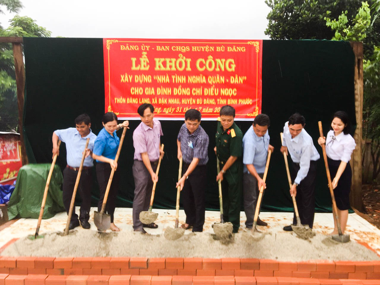 (QK7 Online) - Ngày 31/7, Ban CHQS huyện Bù Đăng, Bộ CHQS tỉnh Bình Phước phối hợp với các ban, ngành, đoàn thể huyện, xã Đặk Nhau khởi công xây dựng “Nhà tình nghĩa quân – dân” cho gia đình đồng chí Điểu Ngọc, Chỉ huy phó Ban CHQS xã Đặk Nhau, có hoàn cảnh khó khăn về nhà ở.