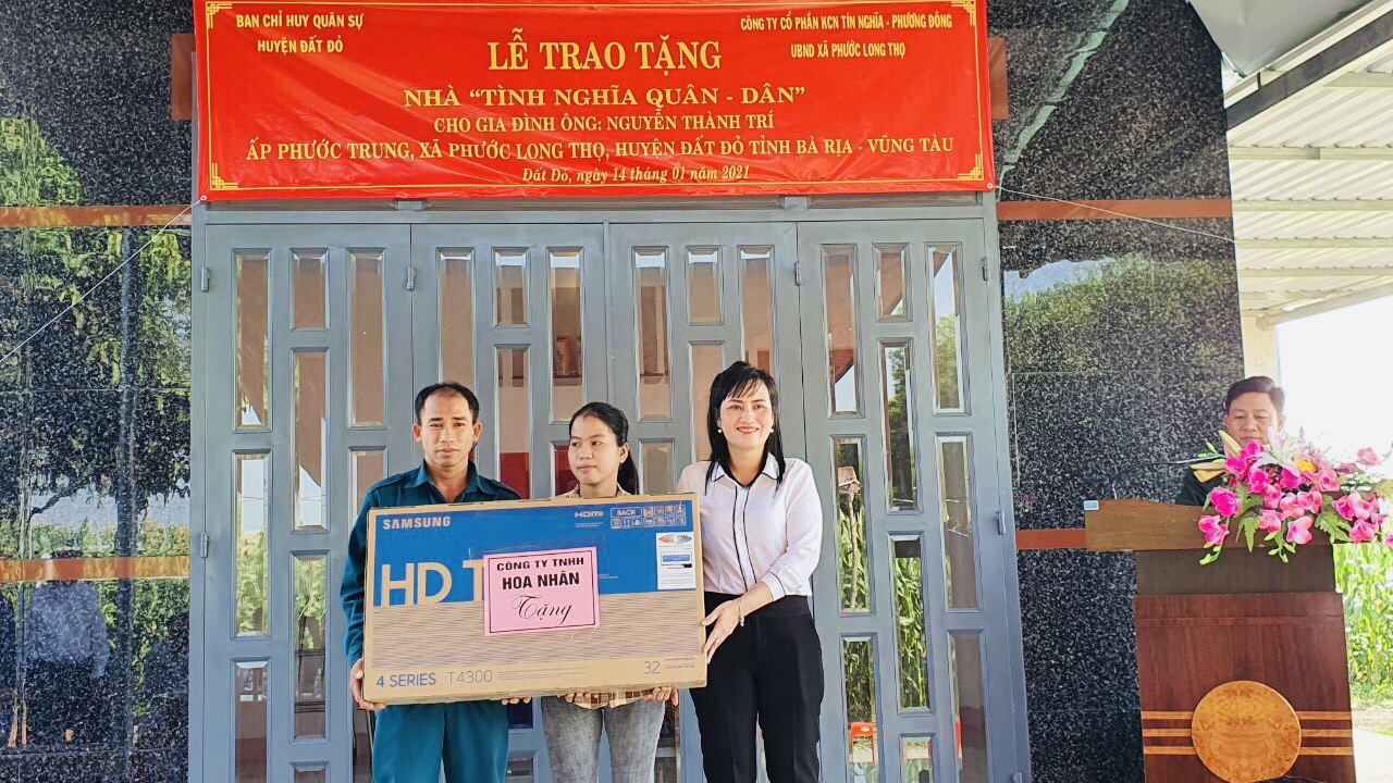 Bà Mai Thị Hoa Nhân, Giám đốc công ty TNHH Hoa Nhân trao tặng ti vi cho gia đình ông Trí.