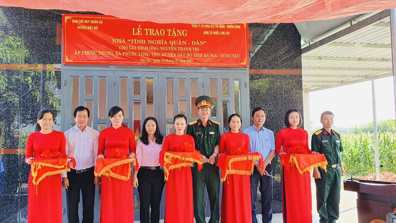 Đại diện Ban CHQS huyện Đất Đỏ và chính quyền địa phương bàn giao "Nhà tình nghĩa quân - dân" cho gia đình ông Nguyễn Thành Trí.