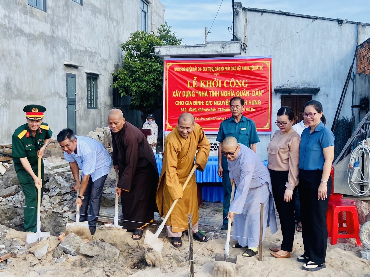 (QK7 Online) - Ngày 7-7, tại khu phố Phước Điền, thị trấn Phước Hải, huyện Đất Đỏ, Ban CHQS huyện Đất Đỏ, tỉnh Bà Rịa-Vũng Tàu phối hợp với Ban Trị sự giáo hội Phật giáo Việt Nam huyện tổ chức lễ khởi công xây dựng “Nhà tình nghĩa quân - dân” tặng gia đình đồng chí Nguyễn Thành Hưng là quân nhân dự bị thuộc Tiểu đoàn Võ Thị Sáu, huyện Đất Đỏ có hoàn cảnh khó khăn về nhà ở.
