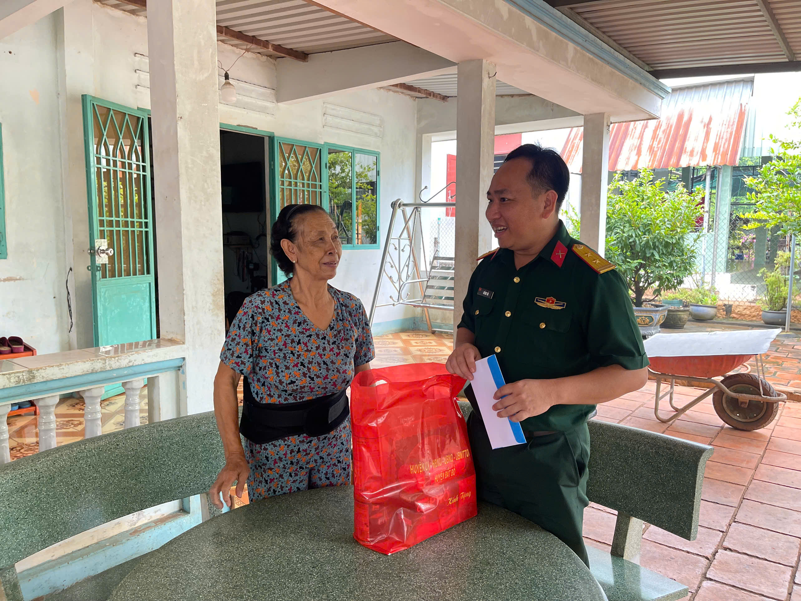 Trung tá Hồ Như Hải, Chính trị viên phó Ban CHQS huyện thăm hỏi, tặng quà gia đình đồng chí Bùi Quang Thơm, Nguyên Phó Chỉ huy trưởng Ban CHQS huyện Đất Đỏ.