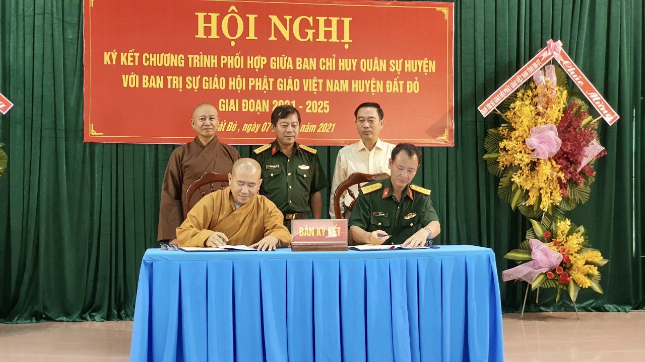 Theo đó, hai bên thống nhất nội dung ký kết bao gồm: Phổ biến kiến thức quốc phòng và an ninh cho tu sĩ, phật tử; thông tin tình hình, chủ trương, đường lối của Đảng, chính sách, pháp luật của Nhà nước, tình hình quốc phòng, an ninh, định hướng tư tưởng cho các tu sĩ, phật tử. Phối hợp thực hiện hoạt động bảo vệ môi trường, chống rác thải nhựa... Phối hợp thực hiện các hoạt động thiện nguyện như: Xây tặng “Nhà tình nghĩa quân - dân” cho các phật tử có hoàn khó khăn về nhà ở; thăm, tặng quà phật tử khó khăn nhân dịp lễ Tết; thực hiện mô hình “Nâng bước tương lai”, hỗ trợ các em có hoàn cảnh đặc biệt khó khăn tới trường. Phối hợp giao lưu văn hóa, văn nghệ, thể dục, thể thao.
