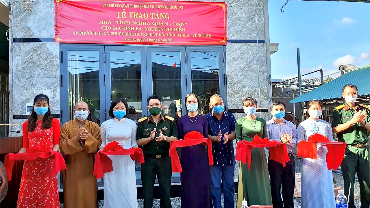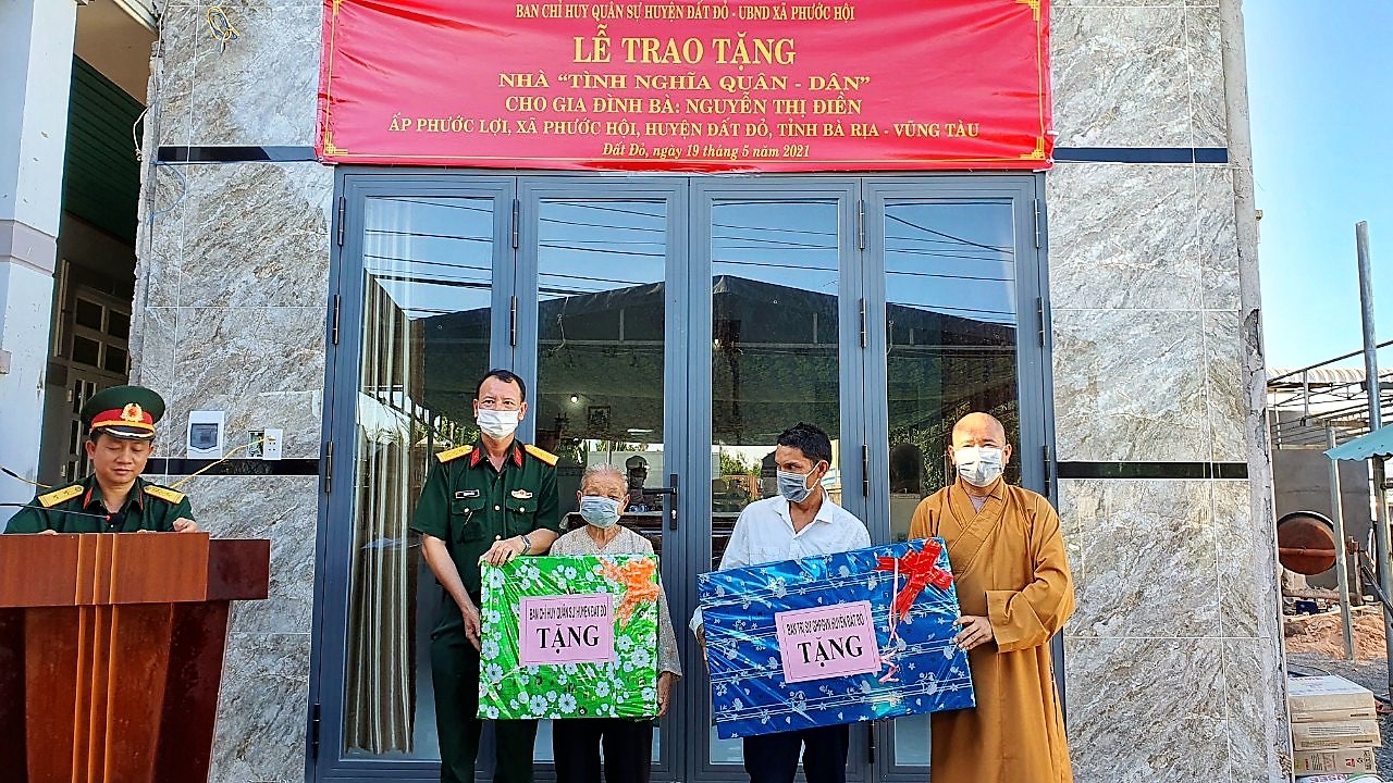 Tại buổi lễ, thủ trưởng Bộ CHQS tỉnh, đại diện Ban CHQS huyện, chính quyền địa phương và Ban Trị sự Giáo hội Phật giáo Việt Nam huyện tặng những vật dụng sinh hoạt cho gia đình bà Nguyễn Thị Điền giúp nhanh chóng ổn định cuộc sống.