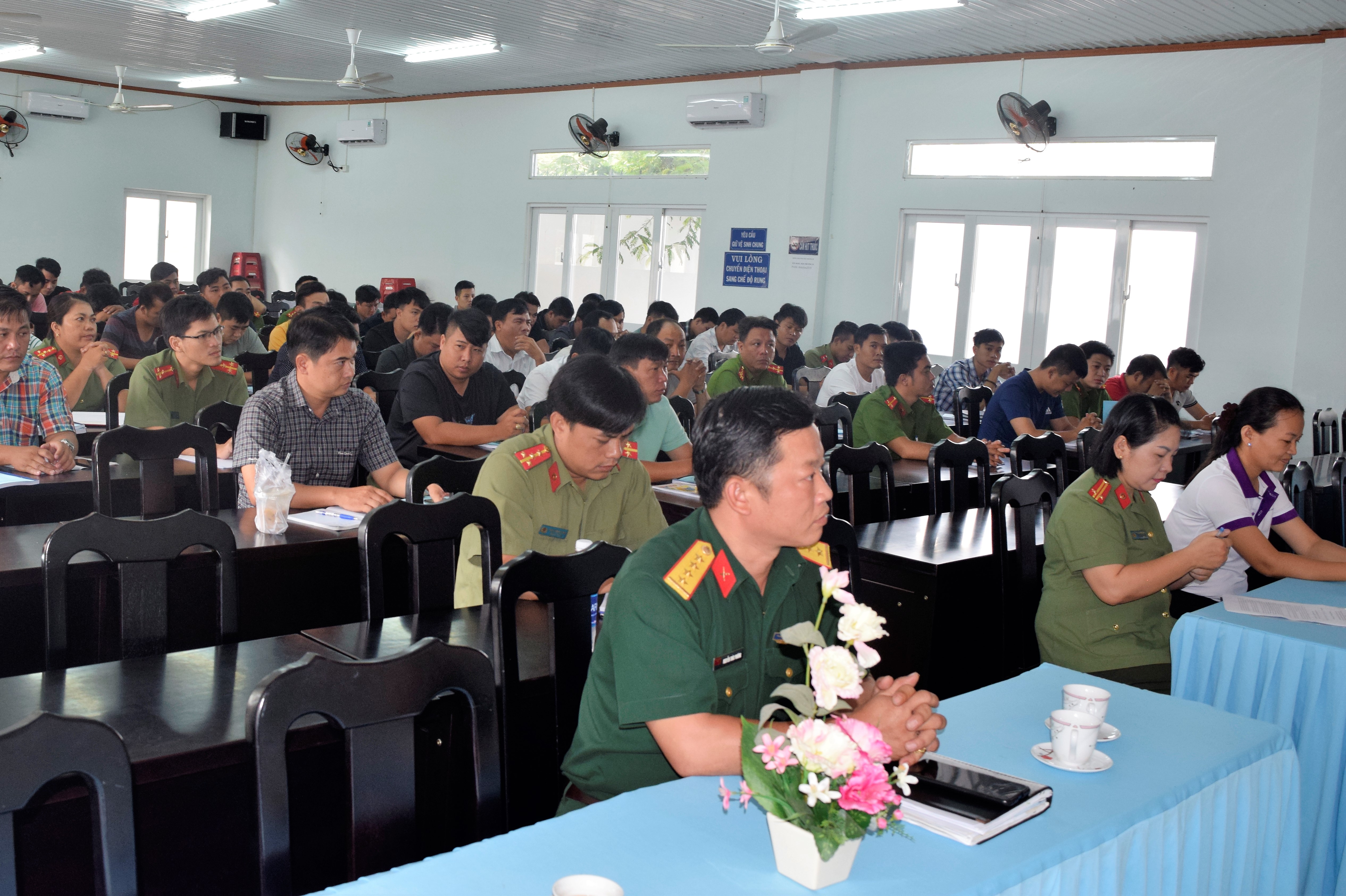 Trong thời gian 3 ngày (31/7 đến 2/8/2019), học viên được thông tin những vấn đề cơ bản về xây dựng khu vực phòng thủ tỉnh, huyện; Biên giới quốc gia và bảo vệ chủ quyền biên giới quốc gia; quản lý và bảo vệ quyền biển, đảo Việt Nam trong tình tình mới; Đường lối, quan điểm của Đảng Cộng sản, chính sách, pháp luật của Nhà nước Việt Nam về bảo vệ an ninh chính trị, kinh tế, văn hóa, tư tưởng, quản lý Nhà nước về an ninh trật tự trong tình hình mới; Chiến lược diễn biến hòa bình, bạo loạn lật đổ đối với cách mạng Việt Nam trong tình hình mới; Nội dung cơ bản của các Luật Giáo dục quốc phòng và an ninh; Nghị định số 13/2014 NĐ-CP ngày 25 tháng 2 năm 2014 của Chính phủ về Quy định chi tiết và biện pháp thi hành Luật Giáo dục quốc phòng và an ninh và Thông tư 05/2015/TT-BCA ngày 07 tháng 01 năm 2015 của Bộ Công an quy định về công tác giáo dục quốc phòng và an ninh trong Công an nhân dân.