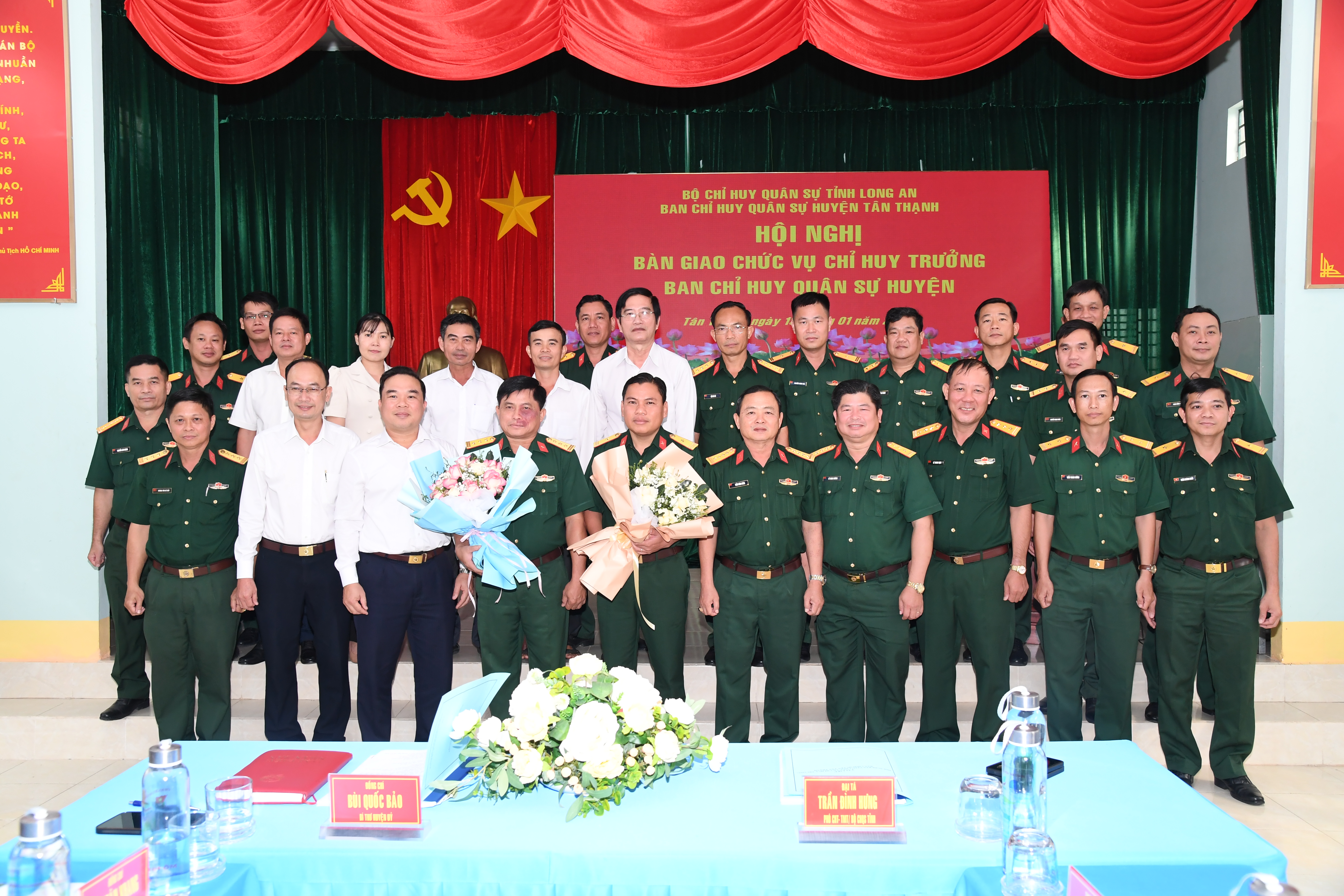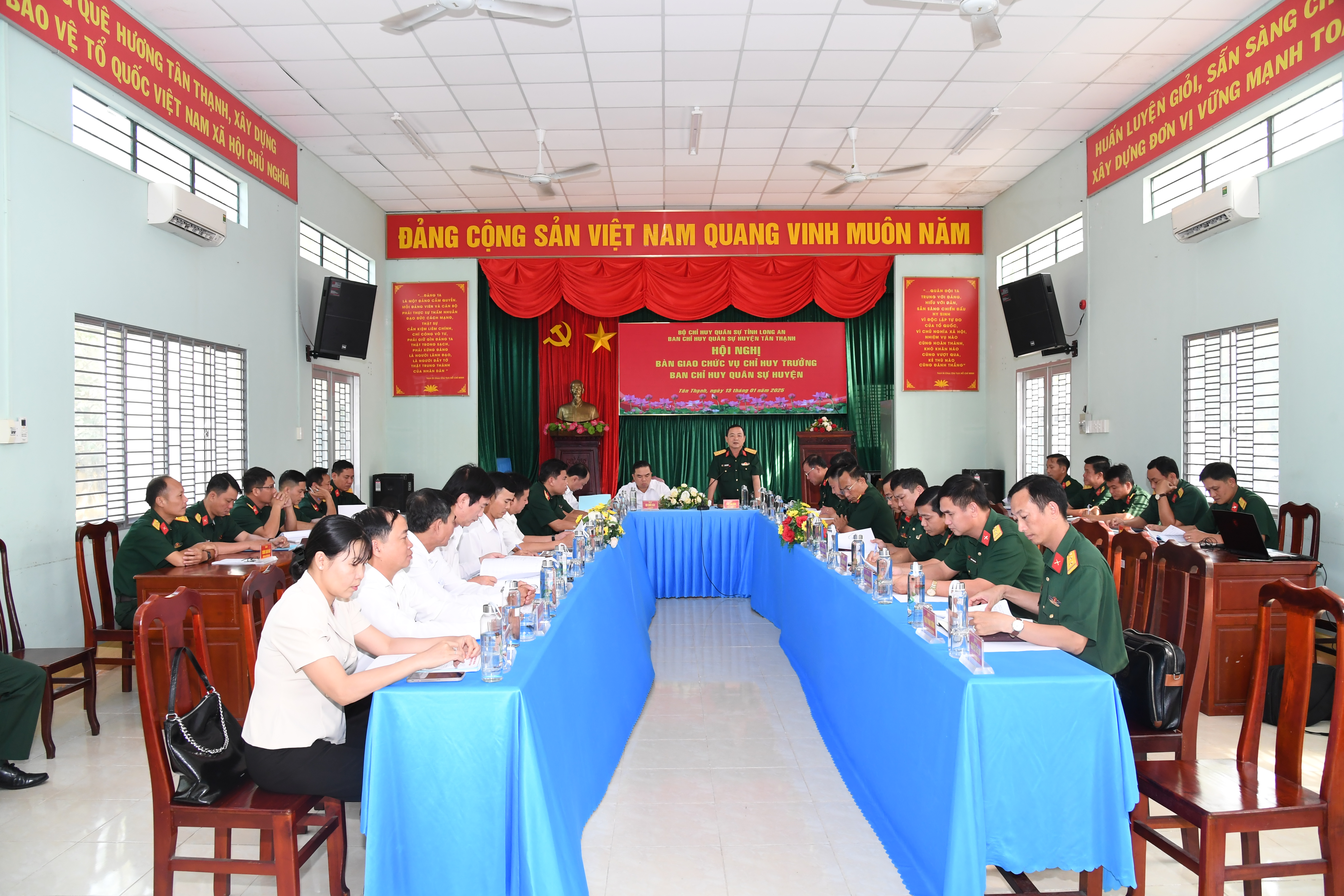 (QK7 Online) - Ngày 13/1, huyện Tân Thạnh, tỉnh Long An tổ chức hội nghị bàn giao chức vụ chỉ huy trưởng Ban CHQS huyện Tân Thạnh. Đại tá Trần Đình Hưng, Phó Chỉ huy trưởng, Tham mưu trưởng Bộ CHQS tỉnh và đồng chí Bùi Quốc Bảo, Bí thư Huyện ủy Tân Thạnh đồng chủ trì hội nghị.