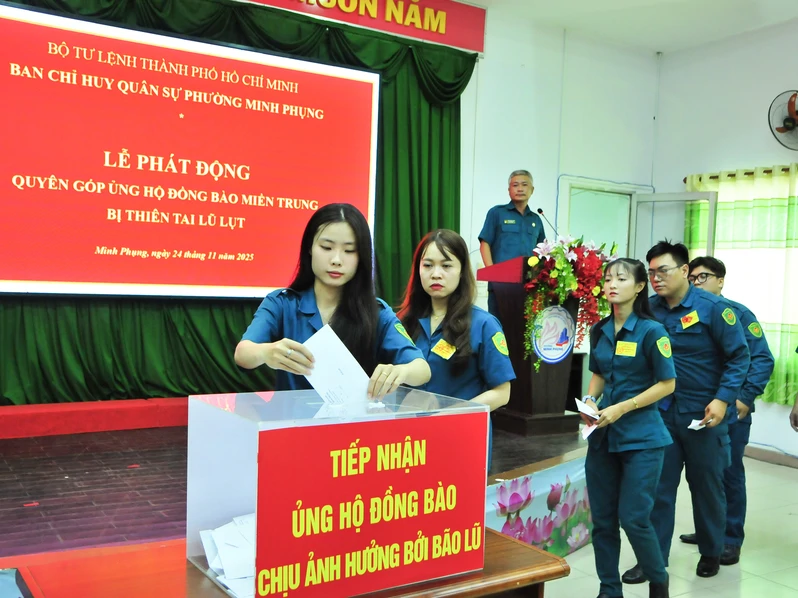 (QK7 Online) - Chiều ngày 24/11, Ban CHQS phường Minh Phụng, Bộ Tư lệnh Thành phố Hồ Chí Minh đã tổ chức lễ phát động quyên góp, ủng hộ đồng bào các tỉnh miền Trung đang chịu ảnh hưởng nặng nề bởi thiên tai, lũ lụt.