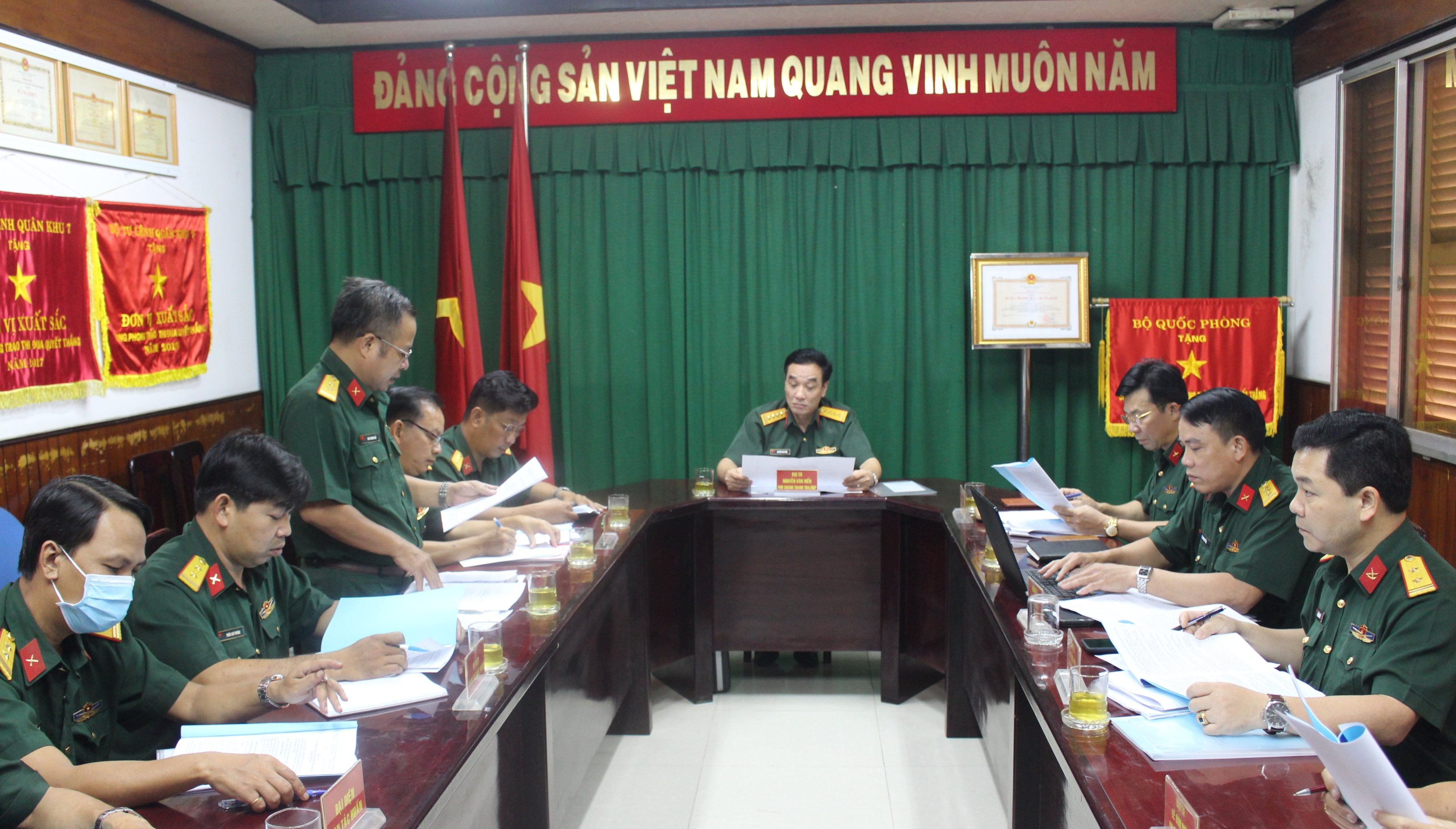 (QK7 Online) - Ngày 4/12, Đoàn công tác Bộ Quốc phòng do Đại tá Nguyễn Văn Xiển - Phó Chánh Thanh tra Bộ Quốc phòng làm trưởng đoàn đến kiểm tra công tác quản lý, sử dụng đất quốc phòng tại Ban CHQS Quận 4. Làm việc với đoàn có Thượng tá Võ Thành Nhân, Chỉ huy trưởng Ban CHQS Quận; Thượng tá Vũ Trọng Khanh, Chính trị viên Ban CHQS Quận và các đồng chí trong Đảng ủy – Ban CHQS Quận 4.